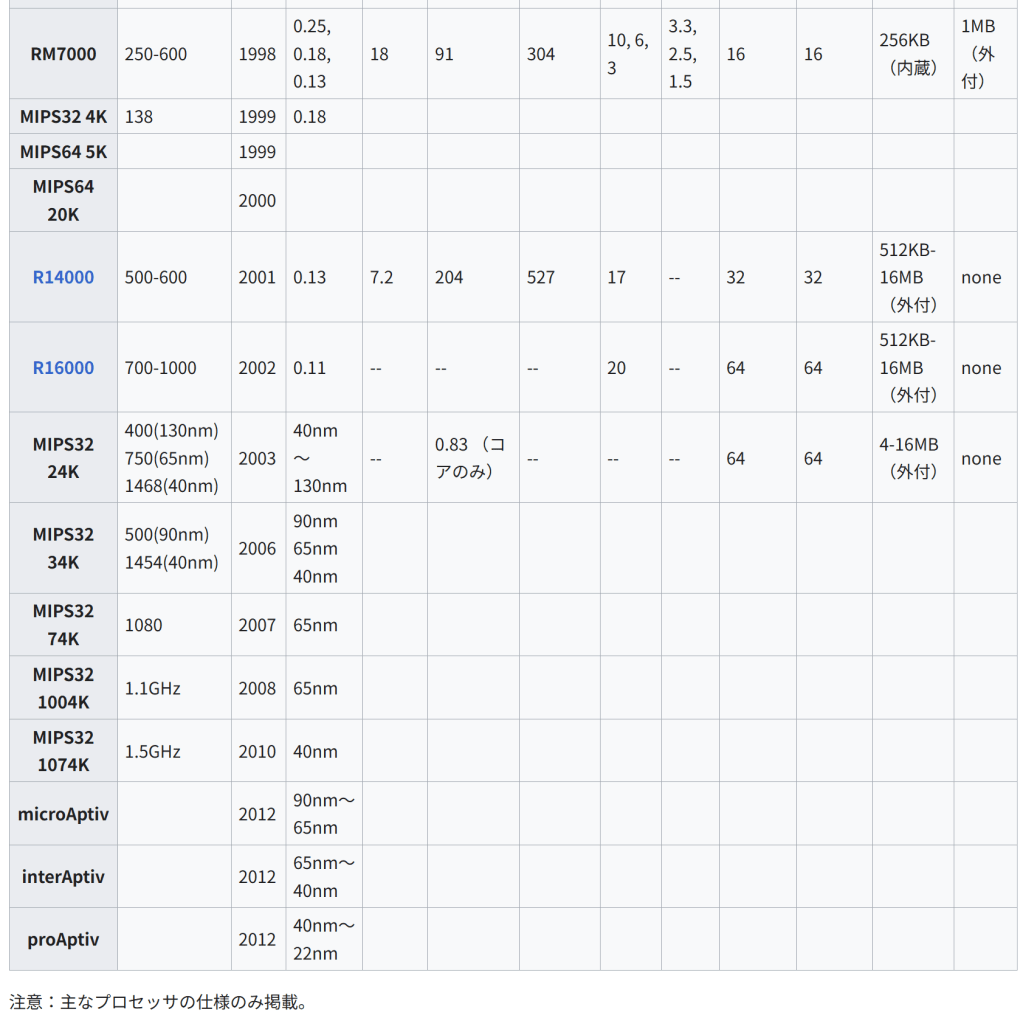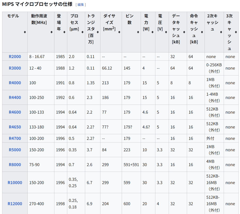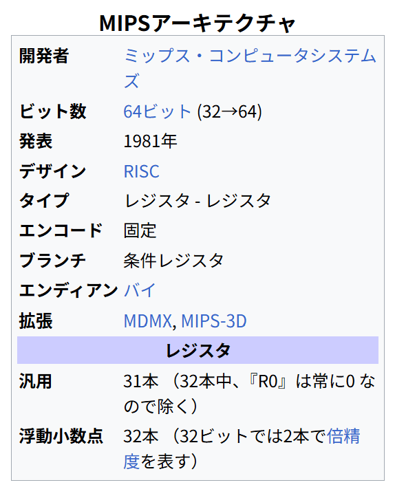 脚注 [脚注の使い方] 注釈 ^ MIPS社のR4000が登場する頃には、DEC社は自社製RISCマイクロプロセッサAlphaを完成させてこれに切り替えた。 ^ R4000は、スーパーパイプラインを世界で最初に導入した市販のマイクロプロセッサである。しかし、これによって、”Microprocessor with Interlocked Pipeline Stages” パイプライン・ステージがインターロックされるマイクロプロセッサと揶揄されることになった。 出典 ^ “MIPS32 Architecture”. ミップス・テクノロジーズ. 2009年5月27日閲覧。 ^ “MIPS64 Architecture”. ミップス・テクノロジーズ. 2009年5月27日閲覧。 ^ “MIPS-3D ASE”. ミップス・テクノロジーズ. 2009年5月27日閲覧。 ^ “MIPS16e”. ミップス・テクノロジーズ. 2021年1月14日閲覧。 ^ “MIPS MT ASE”. ミップス・テクノロジーズ. 2009年5月27日閲覧。 ^ University of California, Davis. “ECS 142 (Compilers) References & Tools page”. 2009年5月28日閲覧。 ^ Rubio, Victor P. “A FPGA Implementation of a MIPS RISC Processor for Computer Architecture Education”. New Mexico State University. 2011年12月22日閲覧。 ^ a b 神保進一著、『マイクロプロセッサ テクノロジ』、日経BP社、1999年12月6日第1版第1刷発行、ISBN 4822209261 ^ Morgan Kaufmann Publishers, Computer Organization and Design, David A. Patterson & John L. Hennessy, Edition 3, ISBN 1-55860-604-1, page 63 ^ “Earl Killian”. Paravirtual. (2010年11月26日) 2010年11月26日閲覧。 ⚠ ^ “S-1 Supercomputer Alumni: Earl Killian”. Clemson University. (2005年6月28日) 2010年11月26日閲覧. “Earl Killian’s early work w… As MIPS’s Director of Architecture, he designed the MIPS III 64-bit instruction-set extension, and led the work on the R4000 microarchitecture. He was a cofounder of QED, which created the R4600 and R5000 MIPS processors. Most recently he was chief architect at Tensilica working on configurable/extensible processors.” ⚠ ^ Jochen Liedtke(1995). On micro kernel construction. 15th Symposium on Operating Systems Principles, Copper Mountain Resort, Colorado. ^ “MIPS® Architecture For Programmers Volume II-A: The MIPS32® Instruction Set Document Number: MD00086 Revision 5.04 December 11, 2013”. p. 41. 2023年12月9日閲覧。 ^ SGI announcing the end of MIPS – ウェイバックマシン(2008年3月7日アーカイブ分) ^ CPUコアベンダからの脱却 – 変貌するMIPS Technologiesの実像を探る ^ http://www.mdronline.com/mpr/h/2006/0626/202602.html China’s Microprocessor Dilemma ^ China’s Institute of Computing Technology Licenses Industry-Standard MIPS Architectures ^ “LinuxDevices article about the Municator”. 2012年12月16日時点のオリジナルよりアーカイブ。2010年12月12日閲覧。 ^ “Yeelong Specs”. 2012年12月10日時点のオリジナルよりアーカイブ。2010年12月12日閲覧。 (LinuxDevices, Oct. 22, 2008) ^ “Silicon Graphics Introduces Enhanced MIPS Architecture to Lead the Interactive Digital Revolution”. Silicon Graphics, Inc. (1996年10月21日). 2011年2月25日閲覧。 ^ a b Gwennap, Linley (18 November 1996). “Digital, MIPS Add Multimedia Extensions”. Microprocessor Report. pp. 24–28. ^ NEC Offers Two High Cost Performance 64-bit RISC Microprocessors ^ 編集人 山形孝雄「PMC-Sierra RMシリーズの概要とRM7900&RM900x2Gの詳細」『Interface2004年7月号』CQ出版社、2004年7月1日、77-88頁。ISSN 0387-9569。 ^ a b MIPS R3000 Instruction Set Summary ^ MIPS Instruction Reference ^ Welcome Page | Open Virtual Platforms ^ Welcome to Imperas | Imperas ^ James Larus. “SPIM MIPS Simulator”. 2007年3月4日閲覧。 ^ EduMIPS64 ^ MARS MIPS simulator – Missouri State University 参考文献 David A. Patterson and John L. Hennessy (2007). Computer Organization and Design: The Hardware/Software Interface. Morgan Kaufmann Publishers. ISBN 978-0-12-370606-5 David A. Patterson and John L. Hennessy; 成田光彰 (2006). コンピュータの構成と設計 第3版(上) ハードウエアとソフトウエアのインタフェース. 日経BP. ISBN 4-8222-8266-X David A. Patterson and John L. Hennessy; 成田光彰 (2006). コンピュータの構成と設計 第3版(下) ハードウエアとソフトウエアのインタフェース. 日経BP. ISBN 4-8222-8267-8 プロセッサを中心としたコンピュータの設計全般に関する書籍で、命令セットの例としてMIPSアーキテクチャを取り上げている。MIPS開発者であるジョン・L・ヘネシーも著者の一人である。 Dominic Sweetman. See MIPS Run. Morgan Kaufmann Publishers. ISBN 1-55860-410-3 MIPSアーキテクチャについての決定版的な本。ハードウェアアーキテクチャだけでなく、コンパイラやOSについても詳述している。 Farquhar, Erin; Philip Bunce. MIPS Programmer’s Handbook. Morgan Kaufmann Publishers. ISBN 1-55860-297-6 関連項目 μClinux PlayStation – CPUとしてR3000Aを搭載。 外部リンク MIPS Architectures at MIPS Technologies Full overview of MIPS architecture Patterson & Hennessy – Appendix A Summary of MIPS assembly language MIPS Instruction reference MARS (MIPS Assembler and Runtime Simulator) MIPS processor images and descriptions at cpu-collection.de A programmed introduction to MIPS assembly Mips bitshift operators MIPS software user’s manual MIPS Architecture history diagram MIPS Open initiative # 2018年12月17日(米国時間)にWave Computing社はMIPS Open(MIPS命令セットアーキテクチャ(ISA)のオープンソース化プログラム)を発表。 表話編歴 MIPSマイクロプロセッサ 表話編歴 プロセッサアーキテクチャ 典拠管理データベース: 国立図書館 ウィキデータを編集 イスラエルアメリカ カテゴリ: MIPSアーキテク