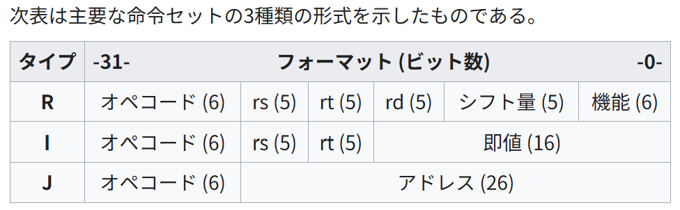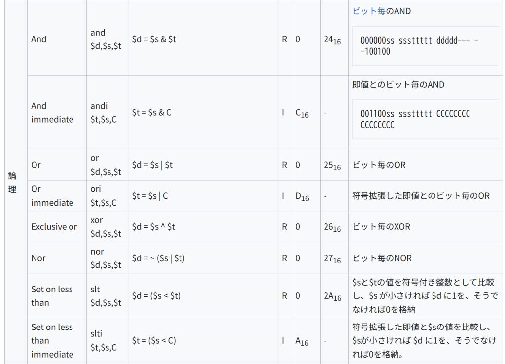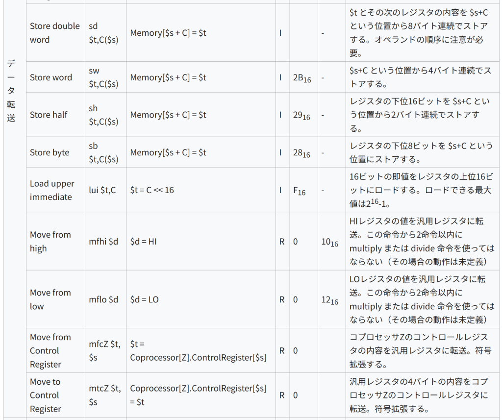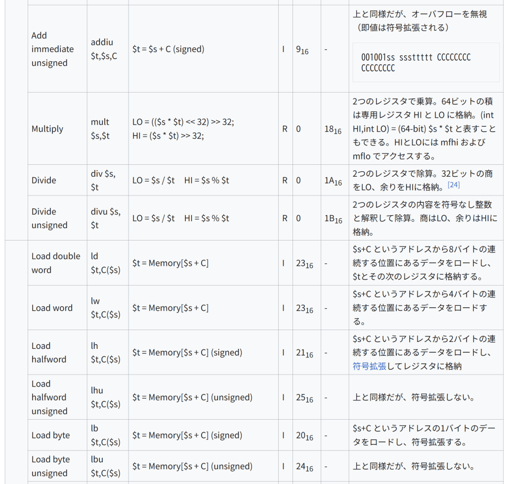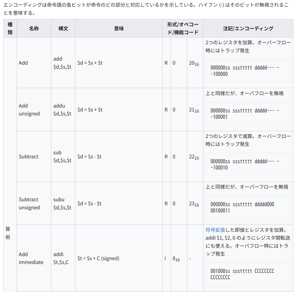 種類 名称 構文 意味 形式/オペコード/機能コード 注記/エンコーディング 算術 Add add $d,$s,$t $d = $s + $t R 0 2016 2つのレジスタを加算。オーバーフロー時にはトラップ発生 000000ss sssttttt ddddd— –100000 Add unsigned addu $d,$s,$t $d = $s + $t R 0 2116 上と同様だが、オーバフローを無視 000000ss sssttttt ddddd— –100001 Subtract sub $d,$s,$t $d = $s – $t R 0 2216 2つのレジスタで減算。オーバーフロー時にはトラップ発生 000000ss sssttttt ddddd— –100010 Subtract unsigned subu $d,$s,$t $d = $s – $t R 0 2316 上と同様だが、オーバーフローを無視 000000ss sssttttt ddddd000 00100011 Add immediate addi $t,$s,C $t = $s + C (signed) I 816 – 符号拡張した即値とレジスタを加算。addi $1, $2, 0 のようにレジスタ間転送にも使える。オーバフロー時にはトラップ発生 001000ss sssttttt CCCCCCCC CCCCCCCC Add immediate unsigned addiu $t,$s,C $t = $s + C (signed) I 916 – 上と同様だが、オーバフローを無視(即値は符号拡張される) 001001ss sssttttt CCCCCCCC CCCCCCCC Multiply mult $s,$t LO = (($s * $t) << 32) >> 32; HI = ($s * $t) >> 32; R 0 1816 2つのレジスタで乗算。64ビットの積は専用レジスタ HI と LO に格納。(int HI,int LO) = (64-bit) $s * $t と表すこともできる。HIとLOには mfhi および mflo でアクセスする。 Divide div $s, $t LO = $s / $t HI = $s % $t R 0 1A16 2つのレジスタで除算。32ビットの商をLO、余りをHIに格納。[24] Divide unsigned divu $s, $t LO = $s / $t HI = $s % $t R 0 1B16 2つのレジスタの内容を符号なし整数と解釈して除算。商はLO、余りはHIに格納。 データ転送 Load double word ld $t,C($s) $t = Memory[$s + C] I 2316 – $s+C というアドレスから8バイトの連続する位置にあるデータをロードし、$tとその次のレジスタに格納する。 Load word lw $t,C($s) $t = Memory[$s + C] I 2316 – $s+C というアドレスから4バイトの連続する位置にあるデータをロードする。 Load halfword lh $t,C($s) $t = Memory$s + C I 2116 – $s+C というアドレスから2バイトの連続する位置にあるデータをロードし、符号拡張してレジスタに格納 Load halfword unsigned lhu $t,C($s) $t = Memory$s + C I 2516 – 上と同様だが、符号拡張しない。 Load byte lb $t,C($s) $t = Memory$s + C I 2016 – $s+C というアドレスの1バイトのデータをロードし、符号拡張する。 Load byte unsigned lbu $t,C($s) $t = Memory$s + C I 2416 – 上と同様だが、符号拡張しない。 Store double word sd $t,C($s) Memory[$s + C] = $t I – $t とその次のレジスタの内容を $s+C という位置から8バイト連続でストアする。オペランドの順序に注意が必要。 Store word sw $t,C($s) Memory[$s + C] = $t I 2B16 – $s+C という位置から4バイト連続でストアする。 Store half sh $t,C($s) Memory[$s + C] = $t I 2916 – レジスタの下位16ビットを $s+C という位置から2バイト連続でストアする。 Store byte sb $t,C($s) Memory[$s + C] = $t I 2816 – レジスタの下位8ビットを $s+C という位置にストアする。 Load upper immediate lui $t,C $t = C << 16 I F16 – 16ビットの即値をレジスタの上位16ビットにロードする。ロードできる最大値は216-1。 Move from high mfhi $d $d = HI R 0 1016 HIレジスタの値を汎用レジスタに転送。この命令から2命令以内に multiply または divide 命令を使ってはならない(その場合の動作は未定義) Move from low mflo $d $d = LO R 0 1216 LOレジスタの値を汎用レジスタに転送。この命令から2命令以内に multiply または divide 命令を使ってはならない(その場合の動作は未定義) Move from Control Register mfcZ $t, $s $t = Coprocessor[Z].ControlRegister[$s] R 0 コプロセッサZのコントロールレジスタの内容を汎用レジスタに転送。符号拡張する。 Move to Control Register mtcZ $t, $s Coprocessor[Z].ControlRegister[$s] = $t R 0 汎用レジスタの4バイトの内容をコプロセッサZのコントロールレジスタに転送。符号拡張する。 論理 And and $d,$s,$t $d = $s & $t R 0 2416 ビット毎のAND 000000ss sssttttt ddddd— –100100 And immediate andi $t,$s,C $t = $s & C I C16 – 即値とのビット毎のAND 001100ss sssttttt CCCCCCCC CCCCCCCC Or or $d,$s,$t $d = $s | $t R 0 2516 ビット毎のOR Or immediate ori $t,$s,C $t = $s | C I D16 – 符号拡張した即値とのビット毎のOR Exclusive or xor $d,$s,$t $d = $s ^ $t R 0 2616 ビット毎のXOR Nor nor $d,$s,$t $d = ~ ($s | $t) R 0 2716 ビット毎のNOR Set on less than slt $d,$s,$t $d = ($s < $t) R 0 2A16 $sと$tの値を符号付き整数として比較し、$s が小さければ $d に1を、そうでなければ0を格納 Set on less than immediate slti $t,$s,C $t = ($s < C) I A16 – 符号拡張した即値と$sの値を比較し、$sが小さければ $d に1を、そうでなければ0を格納。 シフト Shift left logical sll $d,$t,C $d = $t << C R 0 0 $sの内容をCビット左にシフト。 2 C O N S T {\displaystyle 2^{CONST}} をかけるのと同等 Shift right logical srl $d,$t,C $d = $t >> C R 0 216 $sの内容をCビットだけ右にシフト。シフトされて空いた上位ビットには0を格納。正の整数を 2 C {\displaystyle 2^{C}} で割ったのと同等。 Shift right arithmetic sra $d,$t,C $