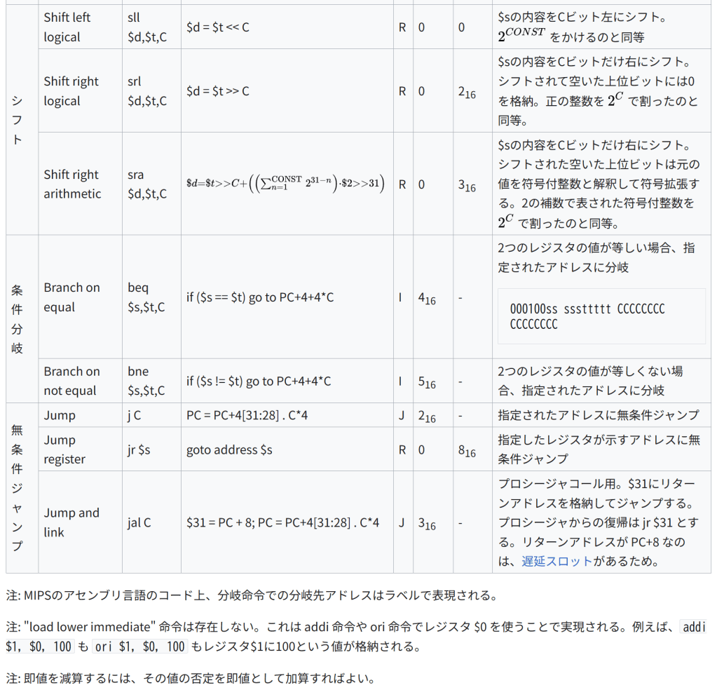 1 CONST 2 31 − n ) ⋅ $ 2 > 31 ) {\displaystyle \scriptstyle \$d=\$t>>C+\left(\left(\sum _{n=1}^{\text{CONST}}2^{31-n}\right)\cdot \$2>>31\right)} R 0 316 $sの内容をCビットだけ右にシフト。シフトされた空いた上位ビットは元の値を符号付整数と解釈して符号拡張する。2の補数で表された符号付整数を 2 C {\displaystyle 2^{C}} で割ったのと同等。 条件分岐 Branch on equal beq $s,$t,C if ($s == $t) go to PC+4+4C I 416 – 2つのレジスタの値が等しい場合、指定されたアドレスに分岐 000100ss sssttttt CCCCCCCC CCCCCCCC Branch on not equal bne $s,$t,C if ($s != $t) go to PC+4+4C I 516 – 2つのレジスタの値が等しくない場合、指定されたアドレスに分岐 無条件ジャンプ Jump j C PC = PC+4[31:28] . C4 J 216 – 指定されたアドレスに無条件ジャンプ Jump register jr $s goto address $s R 0 816 指定したレジスタが示すアドレスに無条件ジャンプ Jump and link jal C $31 = PC + 8; PC = PC+4[31:28] . C4 J 316 – プロシージャコール用。$31にリターンアドレスを格納してジャンプする。プロシージャからの復帰は jr $31 とする。リターンアドレスが PC+8 なのは、遅延スロットがあるため。 注: MIPSのアセンブリ言語のコード上、分岐命令での分岐先アドレスはラベルで表現される。