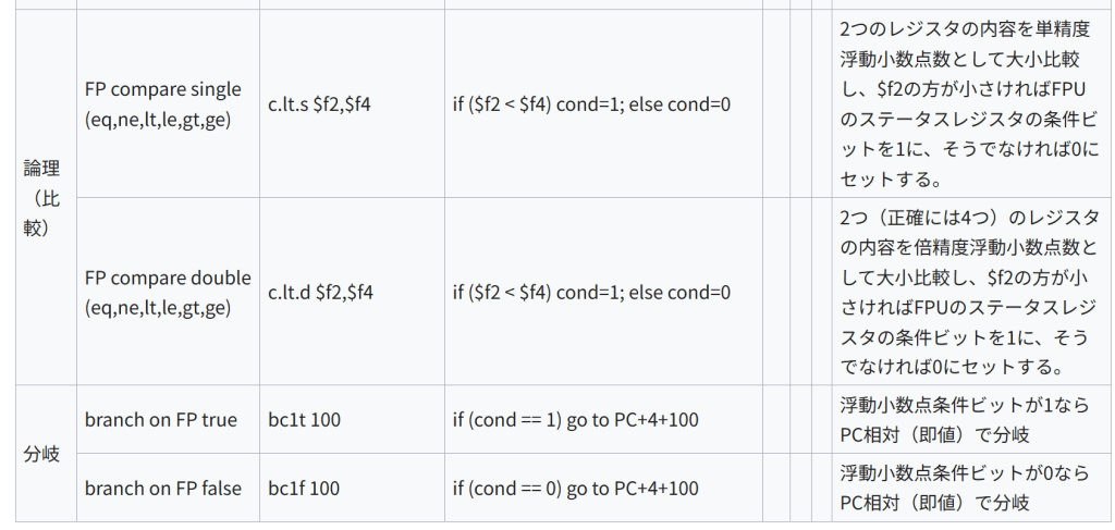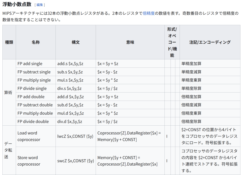 種類 名称 構文 意味 形式/オペコード/機能 注記/エンコーディング 算術 FP add single add.s $x,$y,$z $x = $y + $z 単精度加算 FP subtract single sub.s $x,$y,$z $x = $y – $z 単精度減算 FP multiply single mul.s $x,$y,$z $x = $y * $z 単精度乗算 FP divide single div.s $x,$y,$z $x = $y / $z 単精度除算 FP add double add.d $x,$y,$z $x = $y + $z 倍精度加算 FP subtract double sub.d $x,$y,$z $x = $y – $z 倍精度減算 FP multiply double mul.d $x,$y,$z $x = $y * $z 倍精度乗算 FP divide double div.d $x,$y,$z $x = $y / $z 倍精度除算 データ転送 Load word coprocessor lwcZ $x,CONST ($y) Coprocessor[Z].DataRegister[$x] = Memory[$y + CONST] I $2+CONST の位置から4バイトをコプロセッサのデータレジスタにロード。符号拡張する。 Store word coprocessor swcZ $x,CONST ($y) Memory[$y + CONST] = Coprocessor[Z].DataRegister[$x] I コプロセッサのデータレジスタの内容を $2+CONST から4バイト連続でストアする。符号拡張する。 論理(比較) FP compare single (eq,ne,lt,le,gt,ge) c.lt.s $f2,$f4 if ($f2 < $f4) cond=1; else cond=0 2つのレジスタの内容を単精度浮動小数点数として大小比較し、$f2の方が小さければFPUのステータスレジスタの条件ビットを1に、そうでなければ0にセットする。 FP compare double (eq,ne,lt,le,gt,ge) c.lt.d $f2,$f4 if ($f2 < $f4) cond=1; else cond=0 2つ(正確には4つ)のレジスタの内容を倍精度浮動小数点数として大小比較し、$f2の方が小さければFPUのステータスレジスタの条件ビットを1に、そうでなければ0にセットする。 分岐 branch on FP true bc1t 100 if (cond == 1) go to PC+4+100 浮動小数点条件ビットが1ならPC相対(即値)で分岐 branch on FP false bc1f 100 if (cond == 0) go to PC+4+100 浮動小数点条件ビットが0ならPC相対(即値)で分岐 擬似命令 MIPSアセンブラは以下の命令を受け付けるが、これらは実際にはMIPSの命令セットに存在しない。アセンブラが同等の命令列に変換し、その際に $1 ($at) レジスタを一時的に使用することがある。