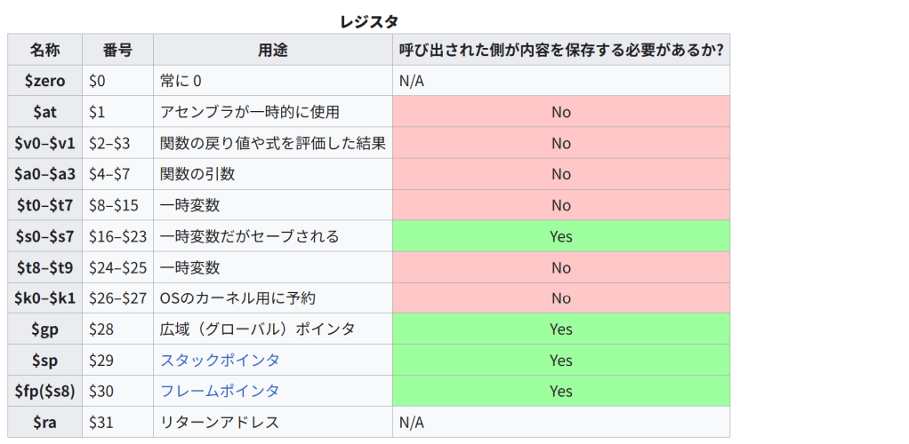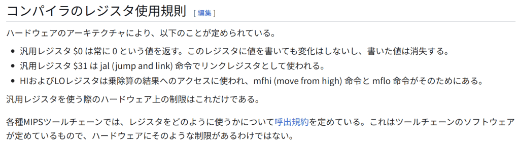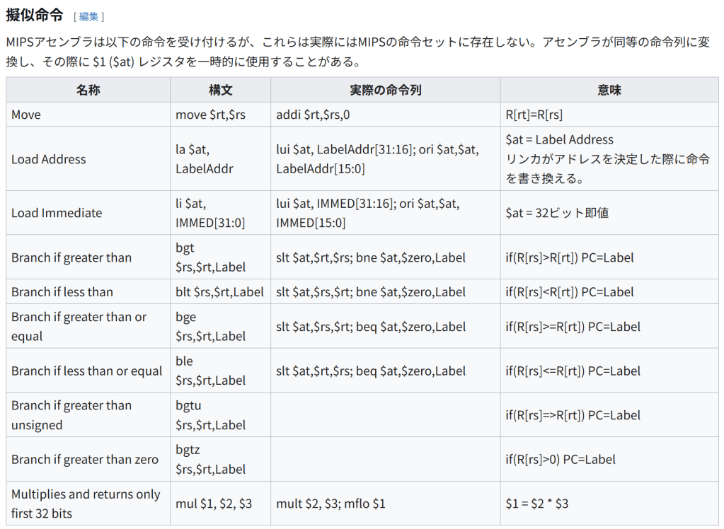 名称 構文 実際の命令列 意味 Move move $rt,$rs addi $rt,$rs,0 R[rt]=R[rs] Load Address la $at, LabelAddr lui $at, LabelAddr[31:16]; ori $at,$at, LabelAddr[15:0] $at = Label Address リンカがアドレスを決定した際に命令を書き換える。 Load Immediate li $at, IMMED[31:0] lui $at, IMMED[31:16]; ori $at,$at, IMMED[15:0] $at = 32ビット即値 Branch if greater than bgt $rs,$rt,Label slt $at,$rt,$rs; bne $at,$zero,Label if(R[rs]>R[rt]) PC=Label Branch if less than blt $rs,$rt,Label slt $at,$rs,$rt; bne $at,$zero,Label if(R[rs]=R[rt]) PC=Label Branch if less than or equal ble $rs,$rt,Label slt $at,$rt,$rs; beq $at,$zero,Label if(R[rs]<=R[rt]) PC=Label Branch if greater than unsigned bgtu $rs,$rt,Label if(R[rs]=>R[rt]) PC=Label Branch if greater than zero bgtz $rs,$rt,Label if(R[rs]>0) PC=Label Multiplies and returns only first 32 bits mul $1, $2, $3 mult $2, $3; mflo $1 $1 = $2 * $3 その他の命令 NOP命令。通常 sll $0,$0,0 という命令を使い、その機械語コードは 0x00000000 となる。 break命令。デバッガでのブレークポイント設定で使用する。 syscall命令。オペレーティングシステムのシステムコールに使われ、ユーザーモードからカーネルモードに移行する。 コンパイラのレジスタ使用規則 ハードウェアのアーキテクチャにより、以下のことが定められている。