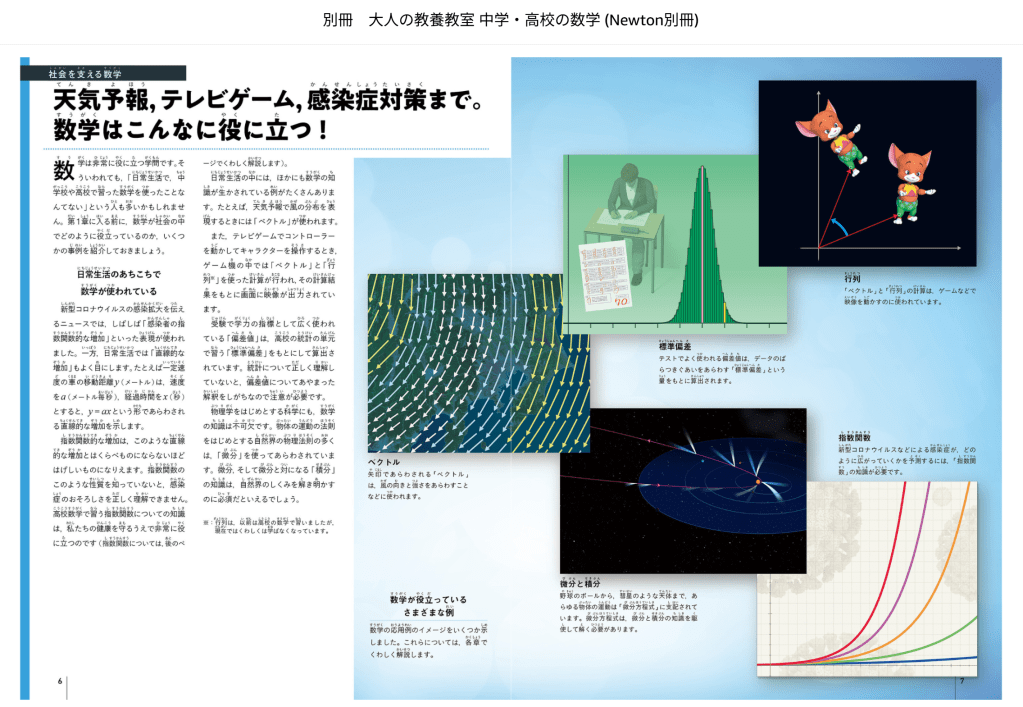 たとえば,「数列」の知識は最新のビデオゲームなどにも活用されていますし,「指数・対数」や「微分積分」で自然界の現象を把握することができます。