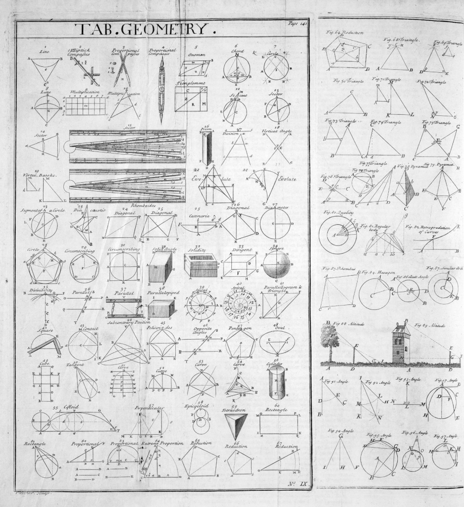 しかしルネサンス期においてはこれらに比べ幾何学の成果は乏しく[11]、当時の目立った成果を上げれば15世紀に透視図の考えを応用し射影幾何学の元となる概念が登場したり[11]、古代ギリシャでは砂に図を書いていたためか[11]運動はタブーであったが、14世紀ごろより図形を直接動かしてその変化考察するという後に解析学へと繋がる考え方も登場した[11]などが上げられる。