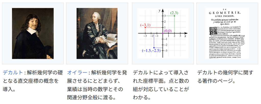 ルネ・デカルトはこの考えを拡張して直交座標系を導入し、解析幾何学を導入した[10][17]。