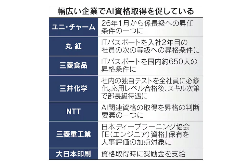 ユニ・チャームは2026年1月から人工知能(AI)関連資格の取得を係長級への昇進要件に加える。AI活用能力を高めて業務の生産性を高めるためで、丸紅や三菱食品も若手に資格取得を義務付ける。日本は海外よりAI学習の意欲が低く、国際競争力の低下が懸念される。企業主導でAIスキルを底上げする動きが広がってきた。