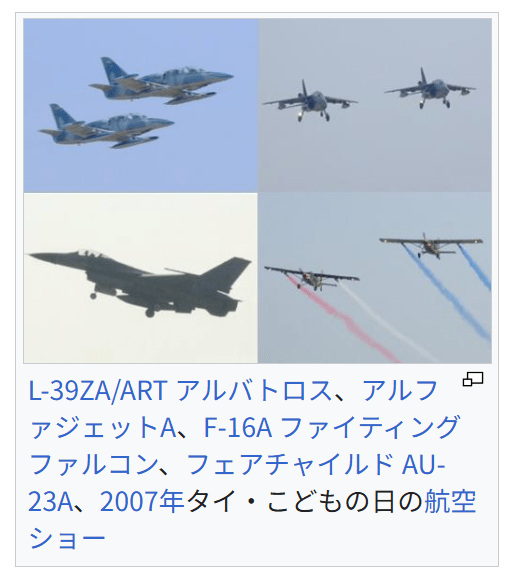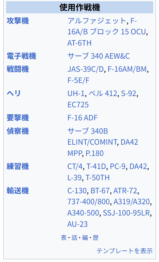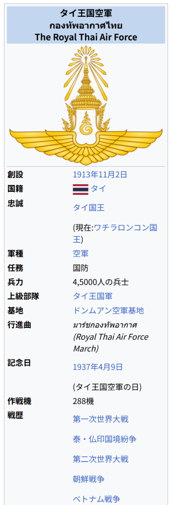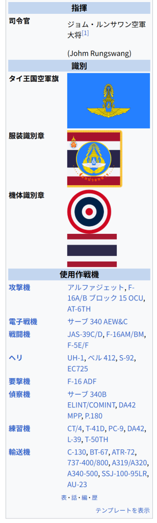 独自開発練習機 – 2007年11月5日、タイ空軍によって開発された新たな試作練習機B.Cho.2(บ.ชอ.2)がチャリット空軍大将によって公式に発表された。開発プロジェクトは2年前から始まり、費用3,000万バーツ。この練習機はタイ空軍で就役していたアエルマッキ SF-260をベースにライセンス再設計された機体。この試作機は、ガムペーンセーン空軍基地のタイ空軍航空教育学校と第604民間パイロット教育飛行隊で初等訓練機として使用することを目的としたタイ空軍モデル-6(RTAF-6)開発のためのテストに使用される[21]。 複発エンジン練習機 – タイ空軍は双発エンジン航空機の訓練に使用する目的で6機のDA42の購入を承諾した[22]。 輸送機・ヘリコプター C-130輸送機改修型 – ロックウェル・コリンズ社は、TAI社とタイ王国空軍のC-130輸送機6機の電子機器・コックピット・索敵・航行・管制システムなどの第2期近代改修を受注し、2008年、前金を受け取り改修中[23]。 新VIP用ヘリコプター – タイ空軍はシコルスキー社にとってS-92 VIP ヘリコプターの得意先となっており、2007年10月7日、空軍は3台の王室用ヘリ購入を公表した。2010年に導入予定[24]。 人員輸送輸送機 – 空軍は約40年使用し老朽化したアブロ 748輸送機を引き継ぎ、4機のATR-72-500を購入。2009年導入予定[25]。 機体損失事故 2008年10月18日、ターク県において、F-16A Block 15が1機墜落。パイロット1名死亡。就役22年になる機体であった[26]。 2010年2月14日、チャイヤプーム県において、F-16 ADFが2機目視外射程戦術航空乗員訓練システムの実施中に空中で衝突・墜落。パイロット2名とも無事[27]。 参考文献 ^ 表記については、航空自衛隊公式サイトによる。 ^ ウィキペディアのタイ語版と英語版で空軍創立年が異なり、タイ版ではこの陸軍内での地位の確定をもって創立年としている(2011年1月21日時点) ^ “中国、カンボジアとタイの国境係争地衝突に「深い懸念」表明”. AFP (2025年7月24日). 2025年7月26日閲覧。 ^ a b c d e f g Alessandra Giovanzanti (2021年10月6日). “Royal Thai Air Force begins receiving H135 training helicopters”. janes.com. 2025年7月8日閲覧。 ^ “Defense & Security 2023: Thailand takes delivery of KGGB kits”. janes.com (2023年11月6日). 2024年8月2日閲覧。 ^ http://www.bangkokpost.com/breakingnews/216975/air-force-chief-to-test-gripen “Air force chief to test fly Gripen” ^ “Thailand signs for more Gripen fighters, anti-ship missiles.”, 23 November 2010 ^ “Air force swaps 3 planes for 1” Bangkokpost 2012年5月14日 ^ Royal Thai Air Force Museum Archived 2007年3月21日, at the Wayback Machine. Historic Painting ^ Wieliczko and Szeremeta 2004, p. 81. ^ Alessandra Giovanzanti (2021年4月6日). “RTAF decommissions two F-16, last five L-39ZA aircraft”. janes.com. 2025年4月25日閲覧。 ^ http://www.f-16.net/f-16_users_article20.html “Thailand KongTup Arkard Thai Royal Thai Air Force RTAF” F-16.Net ^ International Herald Tribune Sweden’s sale of fighter jets to Thailand generates controversy ^ Ny Teknik, (スウェーデン語) ^ Bangkok Post Chalit insists purchase of Swedish jets appropriate, also the best deal. ^ “Air_Force_to_get_12_jets”The_Nation, October 17, 2007. ^ MCOT News Chalit Cabinet gives green light to buy Swedish jet fighters. ^ Flight International Thai cabinet approves budget for Saab Gripen fighters. ^ Gripen International Gripen agreement between Sweden and Thailand signed. ^ 「タイ空軍、スウェーデン製戦闘機配備へ」ニュースクリップ紙 2011年2月24日 ^ RTAF News กองทัพอากาศประสบผลสำเร็จในการสร้างเครื่องบินต้นแบบ บ.ชอ.๒ (タイ語) ^ Diamond Aircraft Industries Royal Thai Air Force chooses 6 DA42 for it’s training program ^ Flight International Contracts ^ Yahoo Royal Thai Air Force Purchases Three VIP S-92(R) Helicopters ^ ATR ATR registers Record Year of Orders with 113 new Aircraft ^ F-16.netRTAF F-16 Crashes ^ F-16.netTwo Thai F-16s crash during exercise] Wieliczko, Leszek A. and Zygmunt Szeremeta. Nakajima Ki 27 Nate (ポーランド語/英語). Lublin, Poland: Kagero, 2004. ISBN 83-89088-51-7. 関連項目 国防省 (タイ) タイ王国軍 タイ王国陸軍 タイ王国海軍 タイ王国国家警察庁 飛べ!ダコタ – 2006年に廃棄したBT-67を日本に運び撮影に使用した。 外部リンク タイ王国空軍公式ウェブページ(タイ語) タイ王国空軍公式ウェブページ(英語) タイ王国空軍博物館 海軍史上の航空機 (タイ語・英語) Wings_タイ空軍についてのレポート Globalsecurity.org スタブアイコン この項目は、軍事に関連した書きかけの項目です。この項目を加筆・訂正などしてくださる協力者を求めています(プロジェクト:軍事、プロジェクト:軍事史/Portal:軍事)。