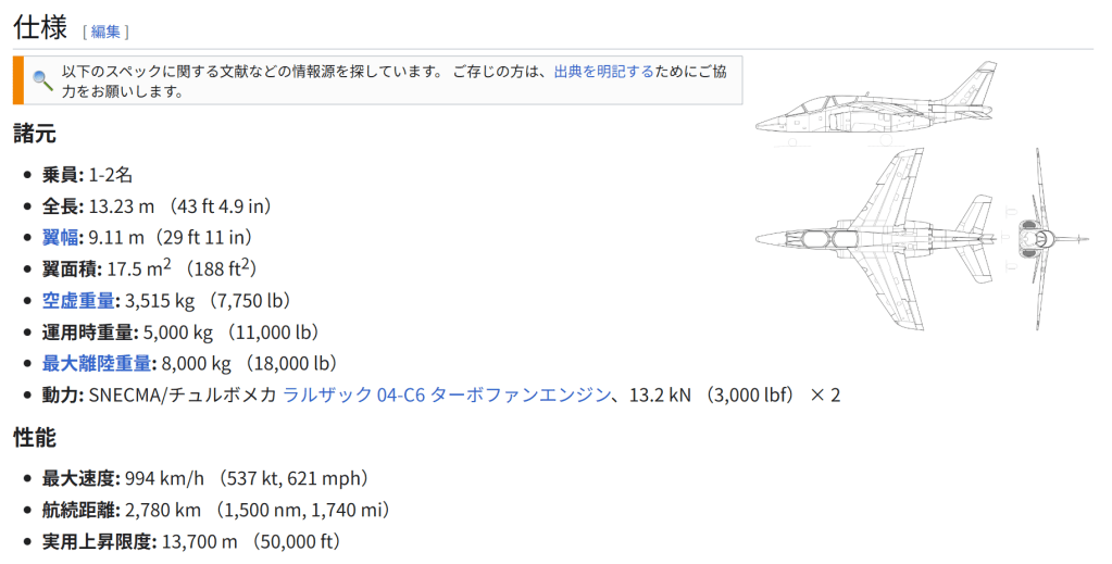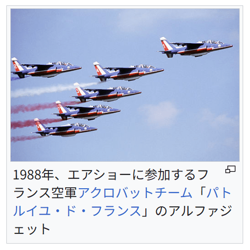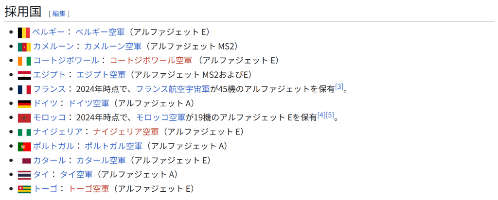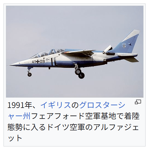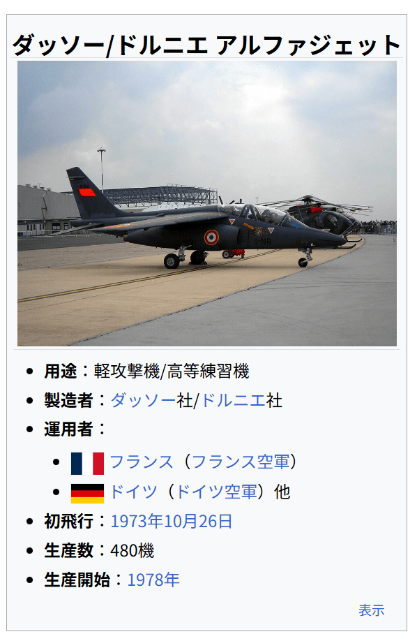 脚注 ^ “グーグル戦闘機、用もないのに? カリフォルニアの空へ”. ギズモード・ジャパン (2008年10月29日). 2012年2月3日閲覧。 ^ “A New (Fighter) Jet for Google’s Founders?” (英語). ニューヨーク・タイムズ(Bitsブログ) (2008年10月23日). 2012年2月3日閲覧。 ^ IISS 2024, p. 94. ^ 柿谷 哲也『万物図鑑シリーズ 全164か国 これが世界の空軍力だ!』笠倉出版社、2014年6月23日、158頁。ISBN 978-4-7730-8717-8。 ^ IISS 2024, pp. 375–376. 参考文献 The International Institute for Strategic Studies (IISS) (2024) (英語). The Military Balance 2024. Routledge. ISBN 978-1-032-78004-7 外部リンク Federation of American Scientists, http://www.fas.org (英語) Alpha Jet, http://www.globalaircraft.org (英語) 関連項目 FMA IA 63 パンパ – ドルニエ社の支援を受けてアルゼンチンで開発されたアルファジェット似の高等練習機