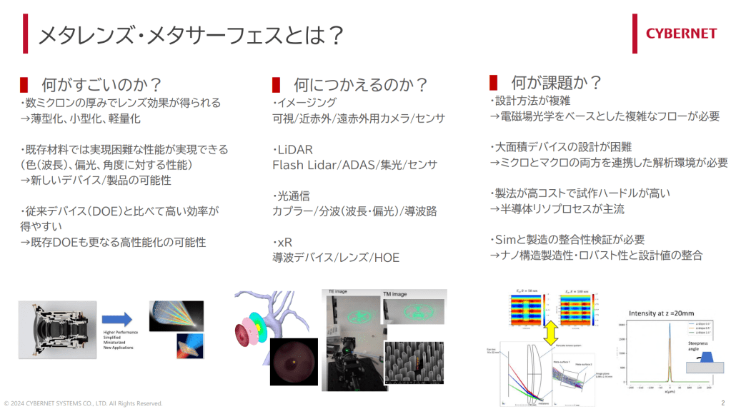 このセミナーでは、メタレンズとは?といった基本的な概要説明と、メタレンズ設計の具体的なフローについて、実際の設計画面のデモを交えながら解説します。