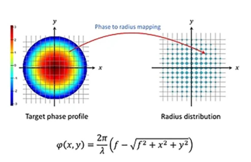 要求仕様が高いほど高度なアルゴリズムが必要となる場合がありますが、この例では設計したい位相に合致するピラーの半径を決定することで一意にメタレンズの構造を決める事ができます。
