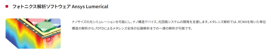 Ansys Lumericalなどと連携することで、メタレンズの設計・解析が効率的に行えます。