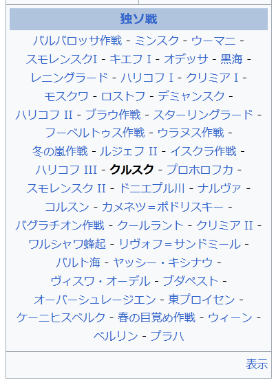 バルバロッサ作戦 ミンスク ウーマニ スモレンスクI キエフ I オデッサ 黒海 レニングラード ハリコフ I クリミア I モスクワ ロストフ デミャンスク ハリコフ II ブラウ作戦 スターリングラード フーベルトゥス作戦 ウラヌス作戦 冬の嵐作戦 ルジェフ II イスクラ作戦 ハリコフ III クルスク プロホロフカ スモレンスク II ドニエプル川 ナルヴァ コルスン カメネツ=ポドリスキー バグラチオン作戦 クールラント クリミア II ワルシャワ蜂起 リヴォフ=サンドミール バルト海 ヤッシー・キシナウ ヴィスワ・オーデル ブダペスト オーバーシュレージエン 東プロイセン ケーニヒスベルク 春の目覚め作戦 ウィーン ベルリン プラハ