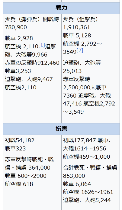 ^ 戦車の全損数はドイツ軍の278輌に対してソ連軍は1614輌。