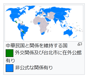 平均降雨量は年間およそ2,515mmであり、雨期に多く、また降雨量は季節、位置、標高によって大きく異なっている。台湾は台風の襲来が多く、毎年平均3 – 4個の台風に襲われている。台風で給水の大きな部分を賄っているが、同時に損壊、洪水、土砂流などの災害も発生している。1996年の台風9号や2009年の台風8号などは、豪雨をもたらした。また、台風以外にも、夏季には台湾語「西北雨(Sai-pak-h?o)サイパッホー」と呼ばれる猛烈な夕立が多い。 政治 詳細は「中華民国の政治」を参照 1950年以来、台湾総督府に代わり使用されている中華民国総統府 A map of the world showing countries which have relations with the Republic of China. Only a few small countries recognize the ROC, mainly in Central, South America and Africa. 中華民国と関係を維持する国 外交関係及び台北市に在外公館有り 非公式な関係有り 中華民国の法律上の領土を示した地図 司法院(台湾の国定史跡建造物) 司法院(国定史跡建造物) 監察院 監察院 台北賓館 台北賓館(日華平和条約調印場)