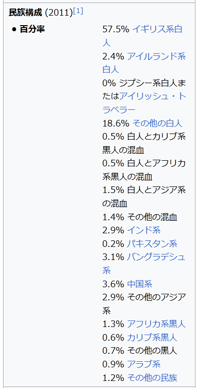 ^ 2011 Census: Ethnic group, local authorities in England and Wales, Office for National Statistics (2012). See Classification of ethnicity in the United Kingdom for the full descriptions used in the 2011 Census.