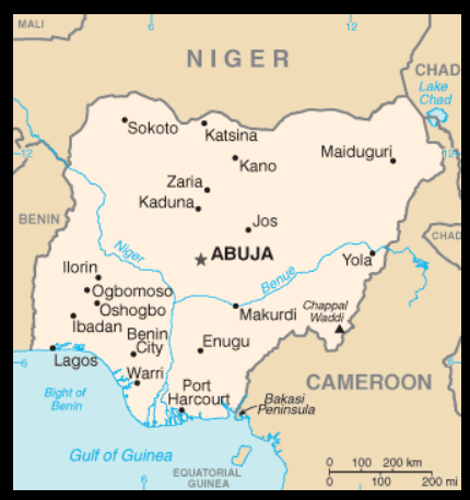 『ナイジェリア連邦共和国(ナイジェリアれんぽうきょうわこく、英語: Federal Republic of Nigeria)、通称ナイジェリアは、アフリカ大陸西南部に位置する連邦制共和国。首都はアブジャ。西にベナン、北をニジェール、北東がチャド、東はカメルーンとそれぞれ国境を接し、南はギニア湾に面し大西洋に通ずる。