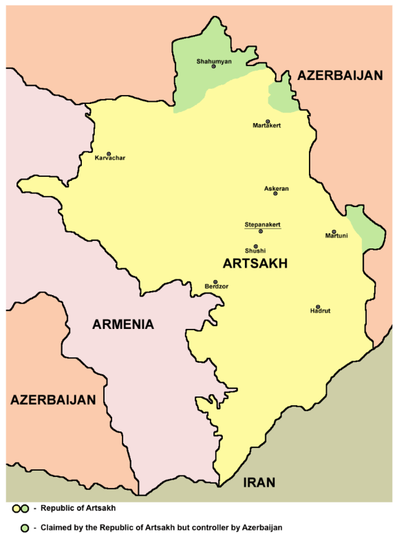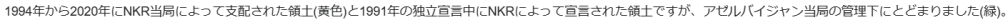 1994年から2020年にNKR当局によって支配された領土(黄色)と1991年の独立宣言中にNKRによって宣言された領土ですが、アゼルバイジャン当局の管理下にとどまりました(緑)。 1992年から2020年まで、ナゴルノカラバフのほとんどは、アルメニア共和国と緊密な関係を維持し、アルメニアドラムを主要な国内通貨として使用する、認識されていないアルツァフ共和国(ナゴルノカラバフ共和国)によって支配されていました。アルメニア当局は、ナゴルノ・カラバフの併合を求める国内勢力から常に圧力を受けています。しかし、アルメニアは国際社会からの非難の反応を恐れて、これに同意しません。アルメニアとナゴルノ・カラバフ共和国の政治生活は密接に関連しています:例えば、1994年から1997年までナゴルノ・カラバフ共和国の大統領であったロバート・コチャリャンは、1997年にアルメニア政府を率い、1998年から2008年<>月までその大統領でした。アルメニア共和国軍は、NKR軍の要員の大多数を構成するNKRとアゼルバイジャン軍の間の連絡線で恒久的なサービスを実施しています。