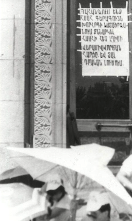 「私たちは、アルメニアSSRの最高会議が会議でアルメニアSSRとナゴルノ・カラバフ自治区の再統一の問題について話し合い、前向きな決定を下すことを要求します。」エレバン、1988年夏。