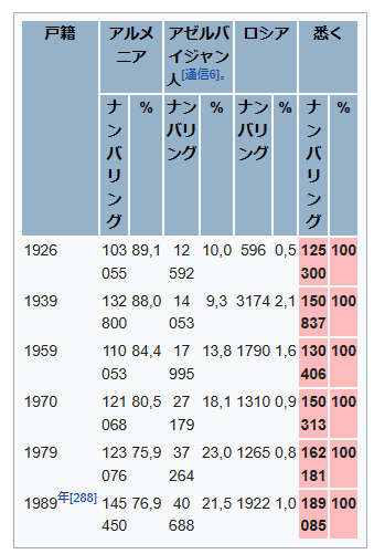 戸籍 アルメニア アゼルバイジャン人[通信6]。 ロシア 悉く ナンバリング % ナンバリング % ナンバリング % ナンバリング % 1926 103 055 89,1 12 592 10,0 596 0,5 125 300 100 1939 132 800 88,0 14 053 9,3 3174 2,1 150 837 100 1959 110 053 84,4 17 995 13,8 1790 1,6 130 406 100 1970 121 068 80,5 27 179 18,1 1310 0,9 150 313 100 1979 123 076 75,9 37 264 23,0 1265 0,8 162 181 100 1989年[288] 145 450 76,9 40 688 21,5 1922 1,0 189 085 100 ナゴルノ カラバフ03.png
