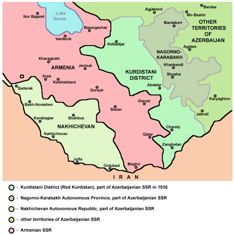 赤いクルディスタン1930.png サミュエル・ハンティントンによれば、ソビエト政府が分割された共和国を作るために国境を変更しようとしたため、ナゴルノ・カラバフはアゼルバイジャンに移された[278]。