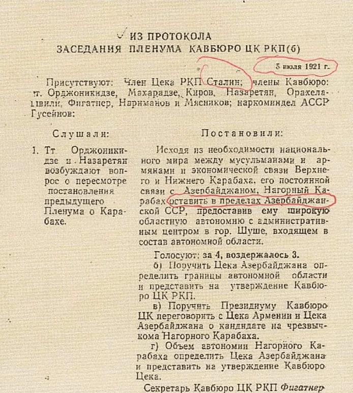 …ナゴルノ・カラバフ自治区をアルメニアSSRに含めることに反対しませんが、ナゴルノ・カラバフ自治区の一部ですが、主にアゼルバイジャン人が住んでいますが、シュシャ地域をアルメニアSSRに移管することには同意しません。 … 同時に、全連邦共産党中央委員会(ボルシェビキ)の注意を喚起する必要があると考え、ナゴルノ・カラバフ自治区をアルメニアSSRに組み込む問題を検討する際には、アゼルバイジャン共和国に隣接し、主にアゼルバイジャン人が住むアルメニアSSRのアジズベヨフ、ヴェディンスキー、カラバグダル地域もアゼルバイジャンSSRに含める必要があります。 これらの地域の並外れた文化的および経済的後進性を考慮に入れて、アゼルバイジャンへの移転は、人口の物質的および生活条件ならびに文化的および政治的サービスを改善することを可能にするであろう。