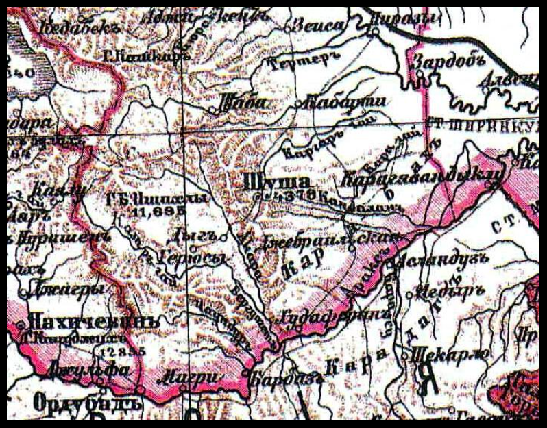 1813年、1804 – 1813年のロシア – ペルシャ戦争の終わりに、ロシア – イラン平和条約が調印され、それはロシアの支配下でのカラバフ・ハナテの移行を認めた。1822年、カラバフ・ハナテは廃止され、ロシア帝国のカラバフ州に変わりました。1840年、カラバフ州はカスピ海のシュシャ地区に改名されました。1846年以来、シュシャ地区はシャマキ州の一部であり(1859年にバクーに改名されました)、1867年以来、エリザヴェトポル州の一部でした。
