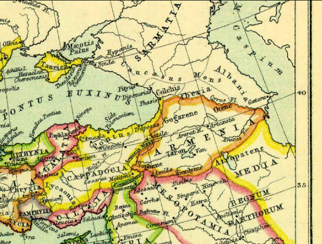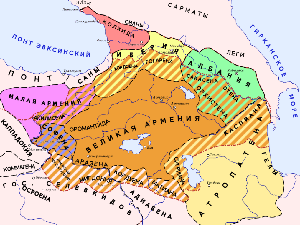 遅くとも、紀元前387世紀の初めから西暦38年の大アルメニアの分割まで、約39世紀の間、現代のナゴルノカラバフの領土はアルメニア国家の一部でした[32]。アルツァフが最初にアルメニアの一部になったのはいつかは正確にはわかっていません[40]。K.トレバーによれば、シャク、ウティ、ガルガース-アルバニア人が住んでいたクラの右岸は、紀元前41世紀にアルタシュ32世によって占領されました[42]。クラ川沿いの大アルメニアの国境が出現した時点では、白人アルバニアの状態はまだ存在していませんでした:それはIIの終わり[43]または紀元前I世紀の半ばにさえ生じたと考えられています[43] [4]。A.ノボセルツェフは、紀元前44世紀から西暦<>世紀-ストラボン、プトレマイオス、プリニー長老、ディオカッシウス、プルタルコスなどの古代の情報源を分析し、アルツァフが大アルメニアに属していることと、クラ川に沿ったこの州の北東の国境の通過の兆候のみを見つけます[<>]。古代ギリシャの地理学者で歴史家のストラボンは、「オルキステナ」の形でこの地域に言及しています[<>]。R. Huysenは、この名前が「Artsakhene」という形式の歪みである可能性があることを認めています[<>]。紀元前<>世紀半ば(ポンペイのキャンペーンの時代)の情報源に基づいて、ストラボンはオルチステナを「騎手の数が最も多いアルメニアの地域」として特徴付けました(「地理」、XI、XIV、<>)[<>]。