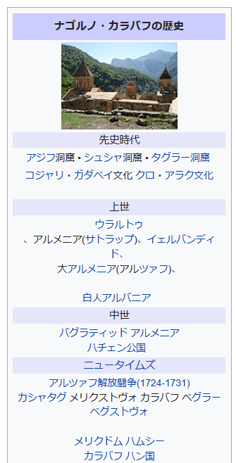 ナゴルノ・カラバフの歴史https://ru.wikipedia.org/wiki/%D0%98%D1%81%D1%82%D0%BE%D1%80%D0%B8%D1%8F_%D0%9D%D0%B0%D0%B3%D0%BE%D1%80%D0%BD%D0%BE%D0%B3%D0%BE_%D0%9A%D0%B0%D1%80%D0%B0%D0%B1%D0%B0%D1%85%D0%B0