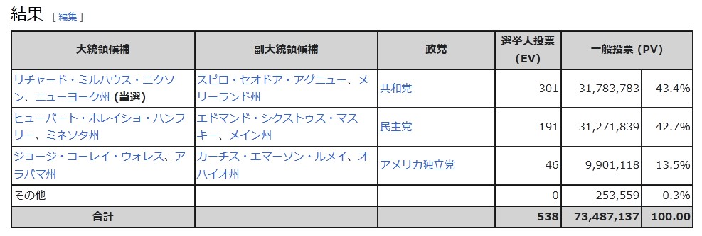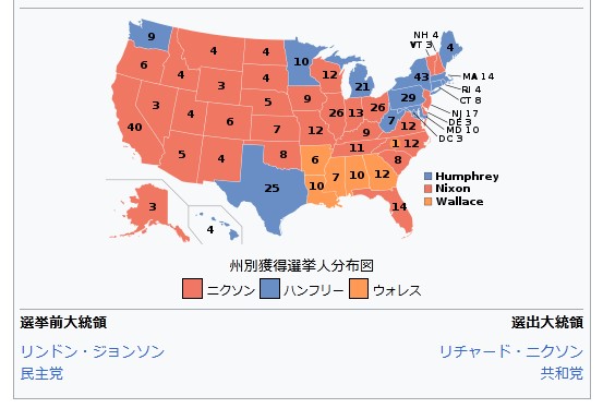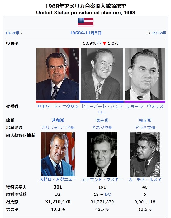 1968年アメリカ合衆国大統領選挙https://ja.wikipedia.org/wiki/1968%E5%B9%B4%E3%82%A2%E3%83%A1%E3%83%AA%E3%82%AB%E5%90%88%E8%A1%86%E5%9B%BD%E5%A4%A7%E7%B5%B1%E9%A0%98%E9%81%B8%E6%8C%99