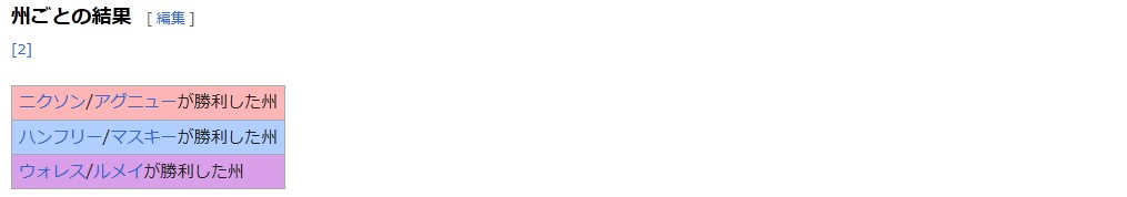 [2] ニクソン/アグニューが勝利した州 ハンフリー/マスキーが勝利した州 ウォレス/ルメイが勝利した州 リチャード・ニクソン