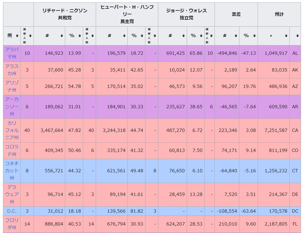 共和党 ヒューバート・H・ハンフリー 民主党 ジョージ・ウォレス 独立党 票差 州計