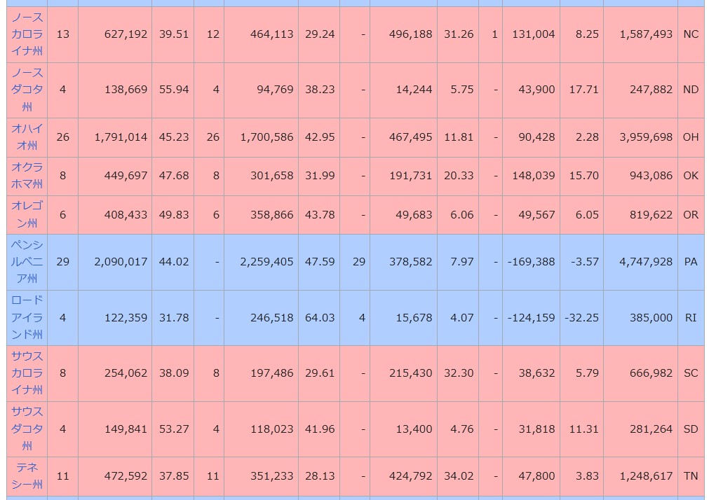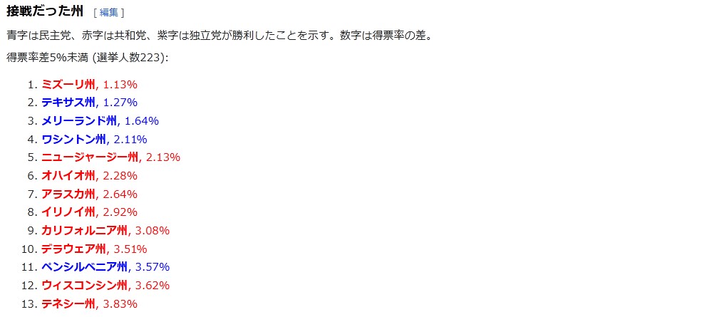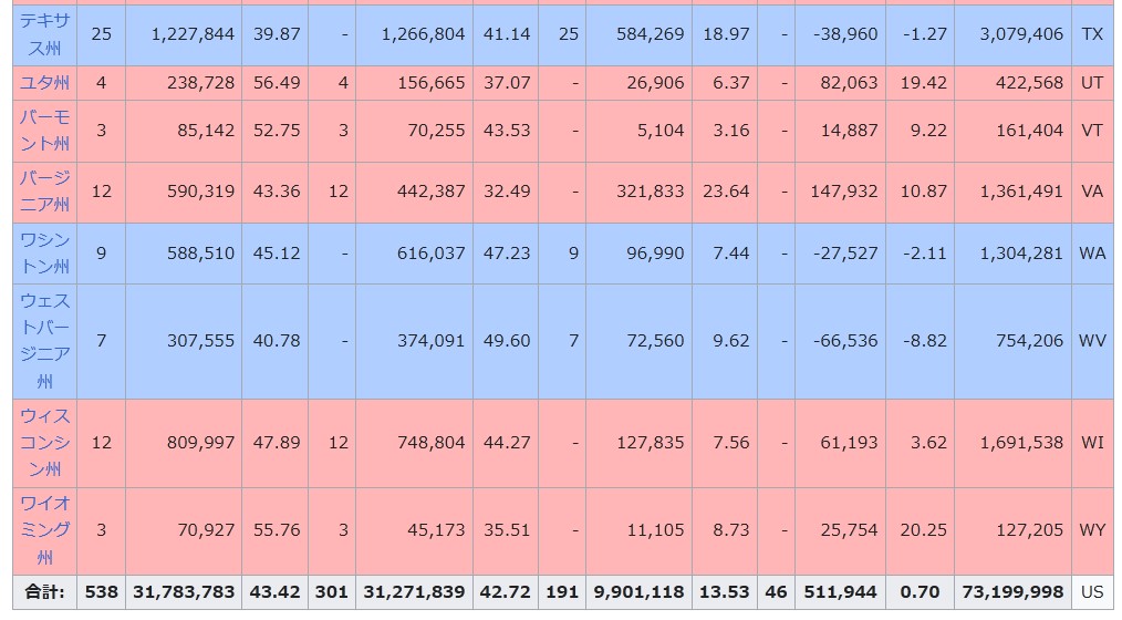 州 選挙人数 # % 選挙人数 # % 選挙人数 # % 選挙人数 # % # アラバマ州 10 146,923 13.99 – 196,579 18.72 – 691,425 65.86 10 -494,846 -47.13 1,049,917 AL アラスカ州 3 37,600 45.28 3 35,411 42.65 – 10,024 12.07 – 2,189 2.64 83,035 AK アリゾナ州 5 266,721 54.78 5 170,514 35.02 – 46,573 9.56 – 96,207 19.76 486,936 AZ アーカンソー州 6 189,062 31.01 – 184,901 30.33 – 235,627 38.65 6 -46,565 -7.64 609,590 AR カリフォルニア州 40 3,467,664 47.82 40 3,244,318 44.74 – 487,270 6.72 – 223,346 3.08 7,251,587 CA コロラド州 6 409,345 50.46 6 335,174 41.32 – 60,813 7.50 – 74,171 9.14 811,199 CO コネチカット州 8 556,721 44.32 – 621,561 49.48 8 76,650 6.10 – -64,840 -5.16 1,256,232 CT デラウェア州 3 96,714 45.12 3 89,194 41.61 – 28,459 13.28 – 7,520 3.51 214,367 DE D.C. 3 31,012 18.18 – 139,566 81.82 3 – – – -108,554 -63.64 170,578 DC フロリダ州 14 886,804 40.53 14 676,794 30.93 – 624,207 28.53 – 210,010 9.60 2,187,805 FL ジョージア州 12 380,111 30.40 – 334,440 26.75 – 535,550 42.83 12 -155,439 -12.43 1,250,266 GA ハワイ州 4 91,425 38.70 – 141,324 59.83 4 3,469 1.47 – -49,899 -21.12 236,218 HI アイダホ州 4 165,369 56.79 4 89,273 30.66 – 36,541 12.55 – 76,096 26.13 291,183 ID イリノイ州 26 2,174,774 47.08 26 2,039,814 44.15 – 390,958 8.46 – 134,960 2.92 4,619,749 IL インディアナ州 13 1,067,885 50.29 13 806,659 37.99 – 243,108 11.45 – 261,226 12.30 2,123,597 IN アイオワ州 9 619,106 53.01 9 476,699 40.82 – 66,422 5.69 – 142,407 12.19 1,167,931 IA カンザス州 7 478,674 54.84 7 302,996 34.72 – 88,921 10.19 – 175,678 20.13 872,783 KS ケンタッキー州 9 462,411 43.79 9 397,541 37.65 – 193,098 18.29 – 64,870 6.14 1,055,893 KY ルイジアナ州 10 257,535 23.47 – 309,615 28.21 – 530,300 48.32 10 -220,685 -20.11 1,097,450 LA メイン州 4 169,254 43.07 – 217,312 55.30 4 6,370 1.62 – -48,058 -12.23 392,936 ME メリーランド州 10 517,995 41.94 – 538,310 43.59 10 178,734 14.47 – -20,315 -1.64 1,235,039 MD マサチューセッツ州 14 766,844 32.89 – 1,469,218 63.01 14 87,088 3.73 – -702,374 -30.12 2,331,752 MA ミシガン州 21 1,370,665 41.46 – 1,593,082 48.18 21 331,968 10.04 – -222,417 -6.73 3,306,250 MI ミネソタ州 10 658,643 41.46 – 857,738 54.00 10 68,931 4.34 – -199,095 -12.53 1,588,510 MN ミシシッピ州 7 88,516 13.52 – 150,644 23.02 – 415,349 63.46 7 -264,705 -40.44 654,509 MS ミズーリ州 12 811,932 44.87 12 791,444 43.74 – 206,126 11.39 – 20,488 1.13 1,809,502 MO モンタナ州 4 138,835 50.60 4 114,117 41.59 – 20,015 7.29 – 24,718 9.01 274,404 MT ネブラスカ州 5 321,163 59.82 5 170,784 31.81 – 44,904 8.36 – 150,379 28.01 536,851 NE ネバダ州 3 73,188 47.46 3 60,598 39.29 – 20,432 13.25 – 12,590 8.16 154,218 NV ニューハンプシャー州 4 154,903 52.10 4 130,589 43.93 – 11,173 3.76 – 24,314 8.18 297,298 NH ニュージャージー州 17 1,325,467 46.10 17 1,264,206 43.97 – 262,187 9.12 – 61,261 2.13 2,875,395 NJ ニューメキシコ州 4 169,692 51.85 4 130,081 39.75 – 25,737 7.86 – 39,611 12.10 327,281 NM ニューヨーク州 43 3,007,932 44.30 – 3,378,470 49.76 43 358,864 5.29 – -370,538 -5.46 6,790,066 NY ノースカロライナ州 13 627,192 39.51 12 464,113 29.24 – 496,188 31.26 1 131,004 8.25 1,587,493 NC ノースダコタ州 4 138,669 55.94 4 94,769 38.23 – 14,244 5.75 – 43,900 17.71 247,882 ND オハイオ州 26 1,791,014 45.23 26 1,700,586 42.95 – 467,495 11.81 – 90,428 2.28 3,959,698 OH オクラホマ州 8 449,697 47.68 8 301,658 31.99 – 191,731 20.33 – 148,039 15.70 943,086 OK オレゴン州 6 408,433 49.83 6 358,866 43.78 – 49,683 6.06 – 49,567 6.05 819,622 OR ペンシルベニア州 29 2,090,017 44.02 – 2,259,405 47.59 29 378,582 7.97 – -169,388 -3.57 4,747,928 PA ロードアイランド州 4 122,359 31.78 – 246,518 64.03 4 15,678 4.07 – -124,159 -32.25 385,000 RI サウスカロライナ州 8 254,062 38.09 8 197,486 29.61 – 215,430 32.30 – 38,632 5.79 666,982 SC サウスダコタ州 4 149,841 53.27 4 118,023 41.96 – 13,400 4.76 – 31,818 11.31 281,264 SD テネシー州 11 472,592 37.85 11 351,233 28.13 – 424,792 34.02 – 47,800 3.83 1,248,617 TN テキサス州 25 1,227,844 39.87 – 1,266,804 41.14 25 584,269 18.97 – -38,960 -1.27 3,079,406 TX ユタ州 4 238,728 56.49 4 156,665 37.07 – 26,906 6.37 – 82,063 19.42 422,568 UT バーモント州 3 85,142 52.75 3 70,255 43.53 – 5,104 3.16 – 14,887 9.22 161,404 VT バージニア州 12 590,319 43.36 12 442,387 32.49 – 321,833 23.64 – 147,932 10.87 1,361,491 VA ワシントン州 9 588,510 45.12 – 616,037 47.23 9 96,990 7.44 – -27,527 -2.11 1,304,281 WA ウェストバージニア州 7 307,555 40.78 – 374,091 49.60 7 72,560 9.62 – -66,536 -8.82 754,206 WV ウィスコンシン州 12 809,997 47.89 12 748,804 44.27 – 127,835 7.56 – 61,193 3.62 1,691,538 WI ワイオミング州 3 70,927 55.76 3 45,173 35.51 – 11,105 8.73 – 25,754 20.25 127,205 WY 合計: 538 31,783,783 43.42 301 31,271,839 42.72 191 9,901,118 13.53 46 511,944 0.70 73,199,998 US 接戦だった州