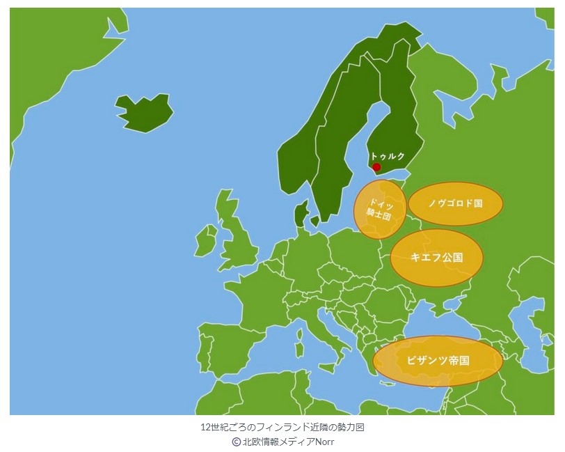 この当時のフィンランドの周辺には、まず東部にキエフ公国(現ウクライナ)、ノブゴロド国、そしてその背後にビザンツ帝国(現トルコ)がありました。そして南西部ではトゥルクを中心にスウェーデンの影響がじわじわと入ってきます。トゥルクは宗教の中心地であると同時に、政治的権力の中心でもありました。