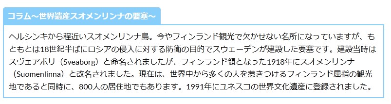 ヘルシンキから程近いスオメンリンナ島。今やフィンランド観光で欠かせない名所になっていますが、もともとは18世紀半ばにロシアの侵入に対する防衛の目的でスウェーデンが建設した要塞です。建設当時はスヴェアボリ(Sveaborg)と命名されましたが、フィンランド領となった1918年にスオメンリンナ(Suomenlinna)と改名されました。現在は、世界中から多くの人を惹きつけるフィンランド屈指の観光地であると同時に、800人の居住地でもあります。1991年にユネスコの世界文化遺産に登録されました。』
