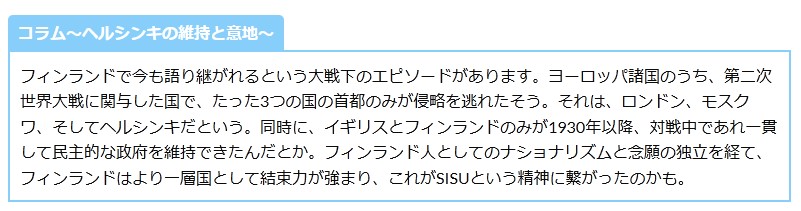 フィンランドで今も語り継がれるという大戦下のエピソードがあります。ヨーロッパ諸国のうち、第二次世界大戦に関与した国で、たった3つの国の首都のみが侵略を逃れたそう。それは、ロンドン、モスクワ、そしてヘルシンキだという。同時に、イギリスとフィンランドのみが1930年以降、対戦中であれ一貫して民主的な政府を維持できたんだとか。フィンランド人としてのナショナリズムと念願の独立を経て、フィンランドはより一層国として結束力が強まり、これがSISUという精神に繋がったのかも。』
