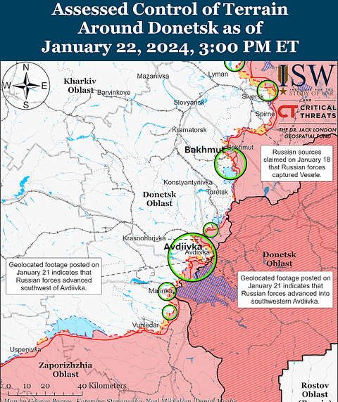 『2024年1月23日:ウクライナ国軍地上軍司令官オレクサンドル・シルシキーシ氏Oleksandr Syrskyi, Commander of the Ground Forces of the Armed Forces of Ukraineは、シヴェルシチナ戦線Sivershchyna fronts(ハルキウ地区Kharkiv region北部か?場所把握できず)とバフムト戦線Bakhmut frontsで戦っている旅団司令官が現地の状況の評価を報告し、両戦線の状況は依然として極めて緊迫しており、ロシア軍は大砲、迫撃砲、攻撃用無人機を広範囲に配備し、攻撃を行っているとした。