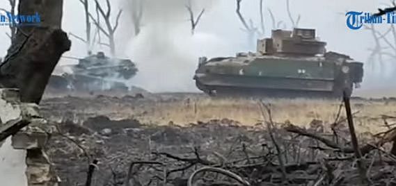 ウクライナ軍のブラッドレー歩兵戦闘車M2A2 “Bradleyが、ロシアの戦車に25mm機関砲を撃ち込み撃破する接近戦の様子。