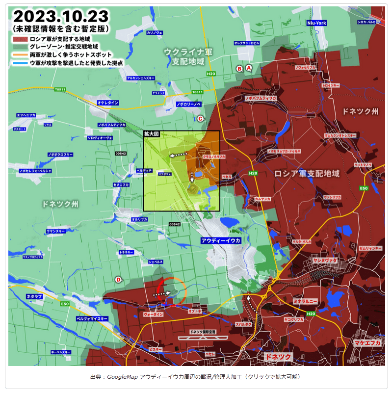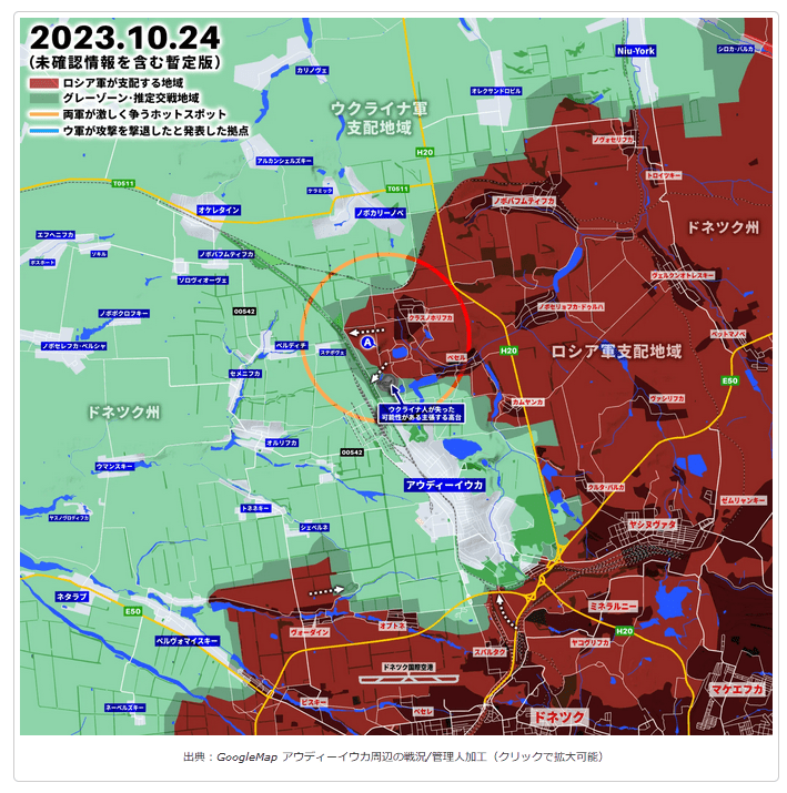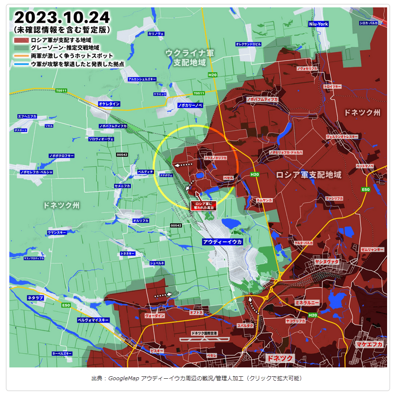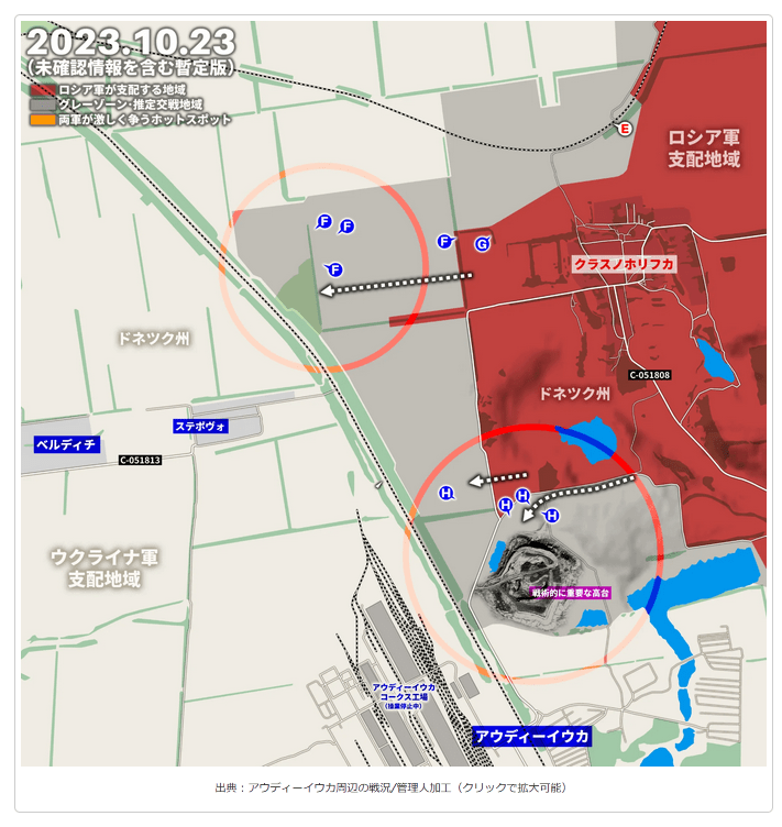 アウディーイウカの戦い、ロシア軍がクラスノホリフカ南西の高台を占領https://grandfleet.info/war-situation-in-ukraine/battle-of-audiivka-russian-troops-occupy-the-high-ground-southwest-of-krasnokhorivka/
