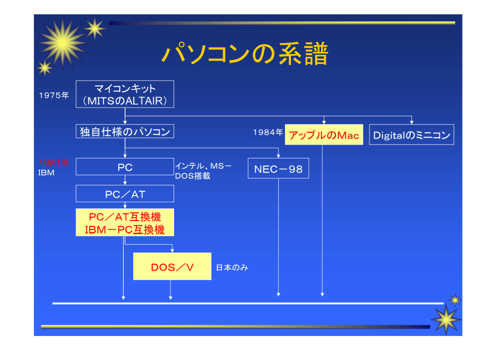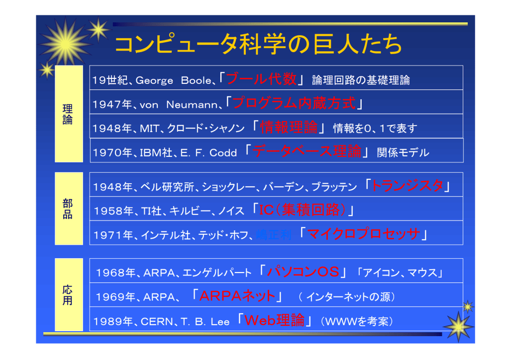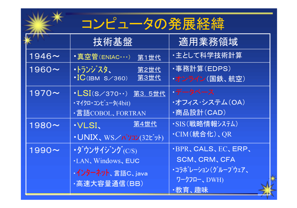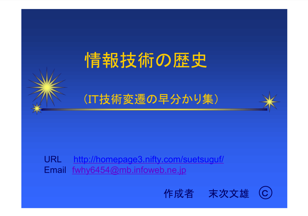 コンピュータの歴史において一体何が行われてきたのかについて、もしもほんの一行で要約するならば、計算機の高機能化、高速化、低価格化、大容量化が行われてきた、ということは言えるであろう。