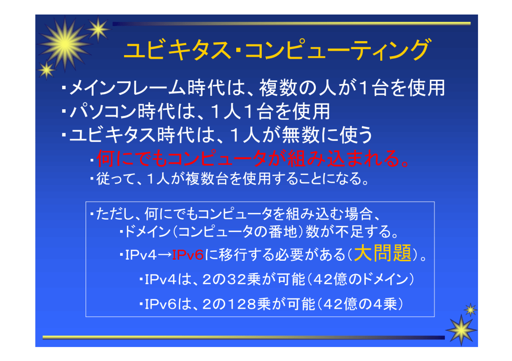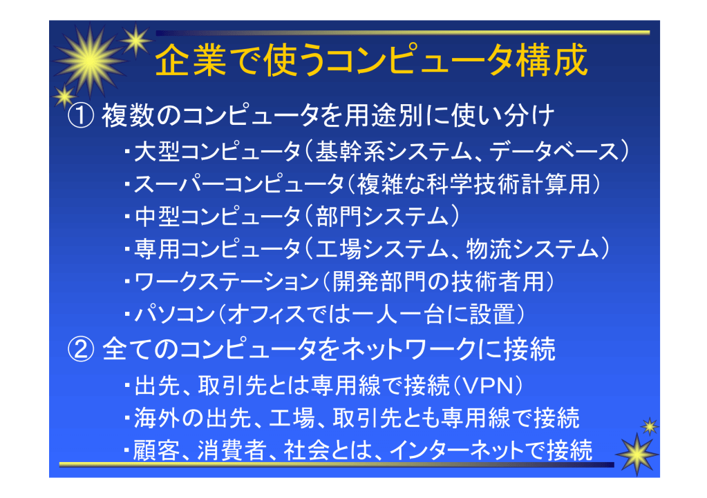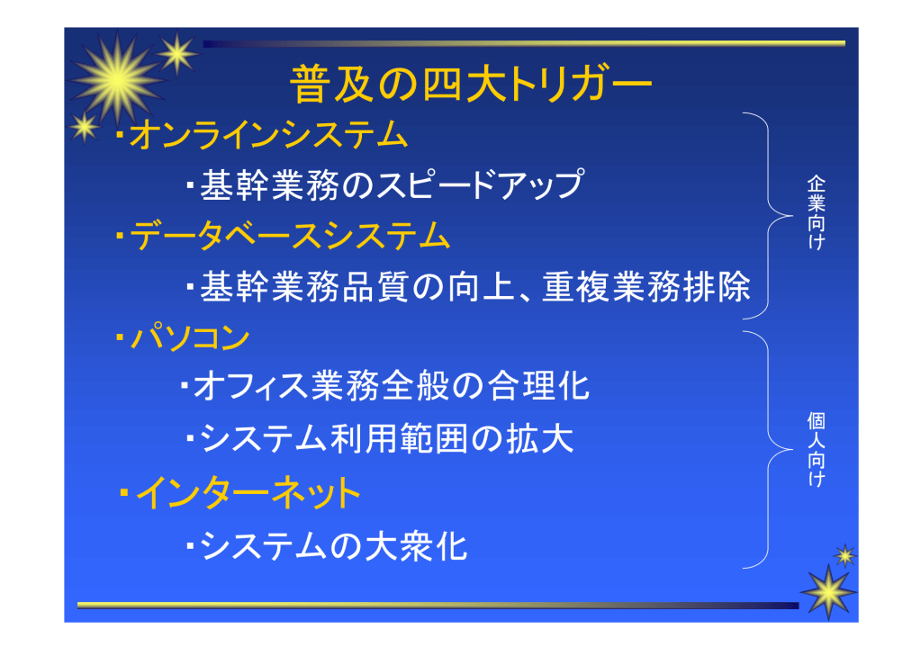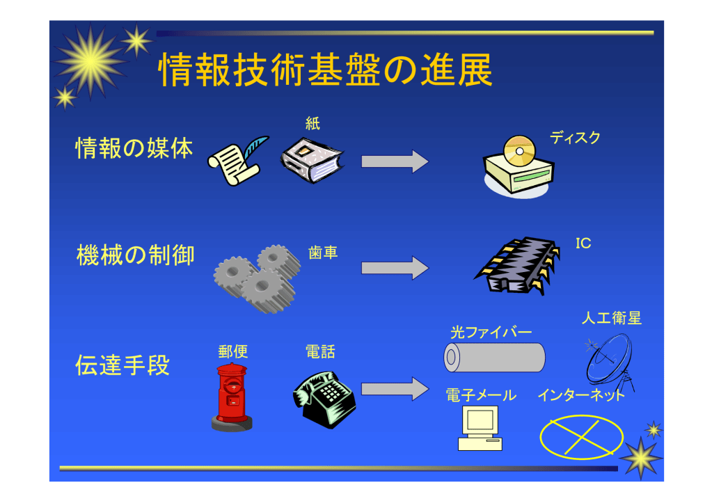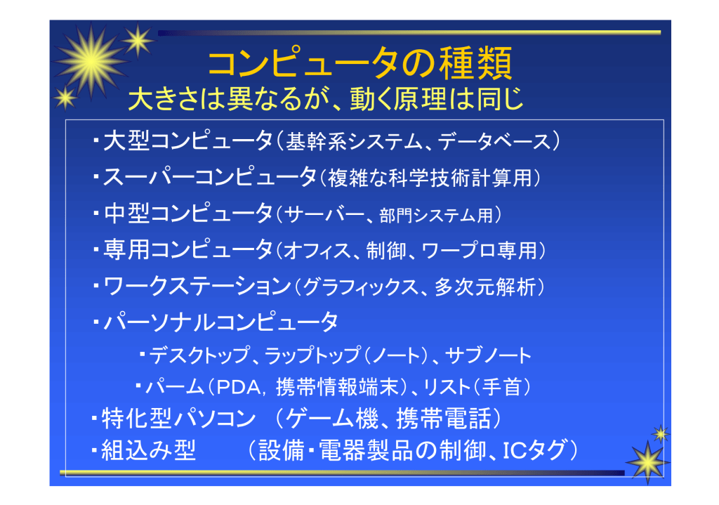 コンピュータの歴史において一体何が行われてきたのかについて、もしもほんの一行で要約するならば、計算機の高機能化、高速化、低価格化、大容量化が行われてきた、ということは言えるであろう。
