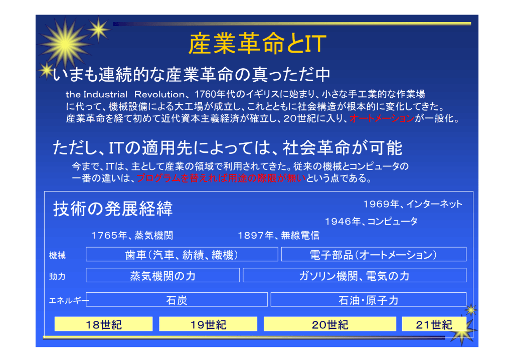 まず第一にコンピュータアーキテクチャ(入出力、データ格納、演算や制御を行うシステムの構成)の歴史である。