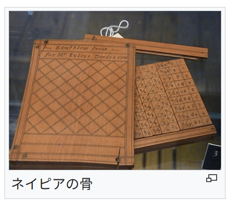 世界初の対数表を作る過程で多数の乗算を行う必要があったため、ネイピアは乗算と除算ができるそろばんのような器具「ネイピアの骨」を考案した[注 3]。