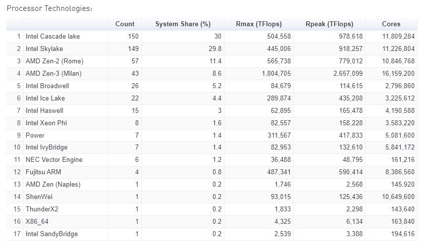 コア 1 インテル カスケード レイク 150 30 504,558 978,618 11,809,284 2 インテル スカイレイク 149 29.8 445,006 918,257 11,226,804 3 AMD Zen-2 (ローマ) 57 11.4 565,738 779,012 10,846,768 4 AMD Zen-3 (ミラノ) 43 8.6 1,804,705 2,657,099 16,159,200 5 インテル ブロードウェル 26 5.2 84,679 114,615 2,796,860 6 インテル アイス レイク 22 4.4 289,874 435,208 3,225,612 7 インテル ハスウェル 15 3 62,895 165,478 4,190,588 8 インテル Xeon Phi 8 1.6 82,557 158,228 3,583,220 9 力 7 1.4 311,567 417,833 5,081,600 10 インテル IvyBridge 7 1.4 82,953 132,610 5,841,172 11 NECベクトルエンジン 6 1.2 36,488 48,795 161,216 12 富士通アーム 4 0.8 487,341 590,414 8,386,560 13 AMD Zen (ナポリ) 1 0.2 1,746 2,568 145,920 14 シェンウェイ 1 0.2 93,015 125,436 10,649,600 15 ThunderX2 1 0.2 1,833 2,298 143,640 16 X86_64 1 0.2 4,325 6,134 163,840 17 インテル SandyBridge 1 0.2 2,539 3,388 194,616