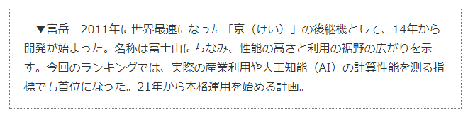 政府の研究開発の強化戦略「統合イノベーション戦略2020」では、富岳を「ソサエティー5・0」の計算基盤と位置付けている。文部科学省は大学や国立研究開発法人などの研究者だけでなく、産業界の利用を促す。萩生田光一文科相は「富岳は国民共有の財産。大学や研究機関だけでなく、民間や高校生など幅広い人々に使ってほしい」と呼びかける。