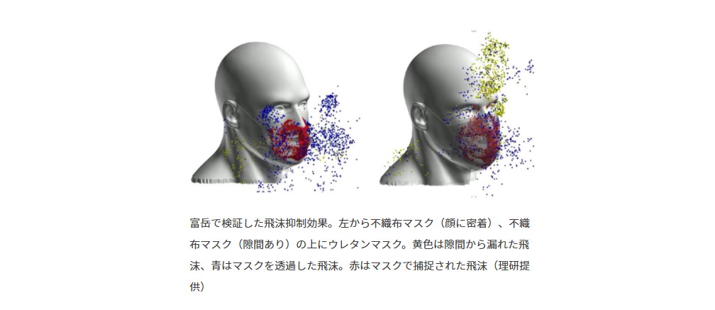 社会的側面からの研究では、ウイルスの飛沫感染予測を行う研究チームが次々と成果を報告。湿度との関係や、タクシー、航空機などでのリスク低減策も公表した。直近ではマスクを2枚重ねる「二重マスク」着用と、不織布マスク1枚を正しく着用した場合とで飛沫拡散の抑制効果に大差がないことを明らかにしている。