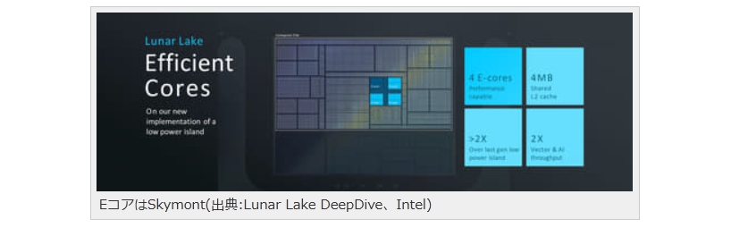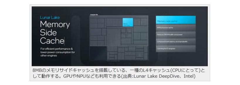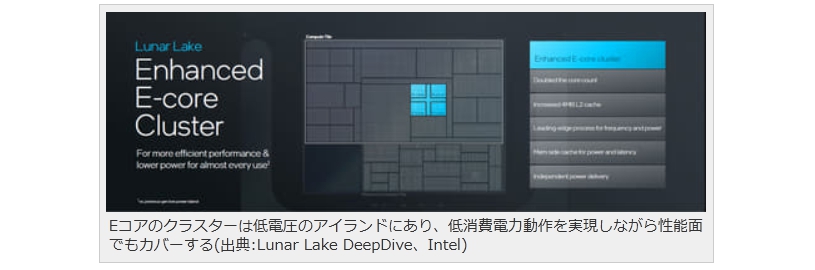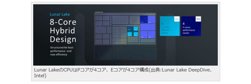 CPUコアは、4つのPコアと4つのEコアという構造になっている。Core Ultra(Meteor Lake)でIntelは、コンピュートタイルとは別にSoCタイルという別のダイの中に低電力Eコア(Low Power E-Core)を用意しており、OSが動作していてアイドル時やあまり負荷が高くないときにはその低電圧Eコアに切り替えて、Pコアと通常版Eコアから構成されているコンピュートタイルをオフにして電力消費を防ぐという仕組みになっていた。