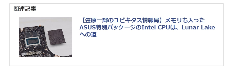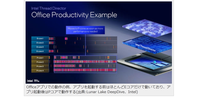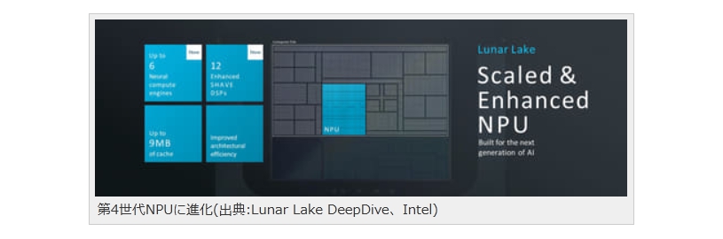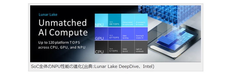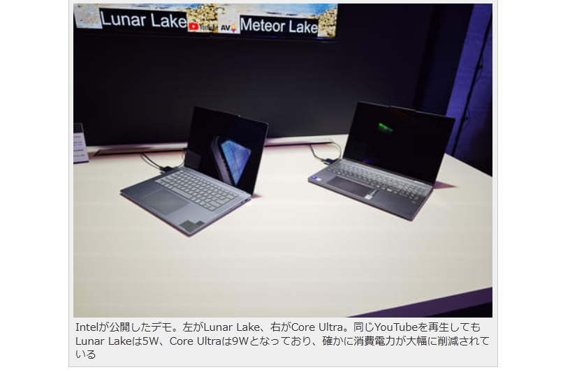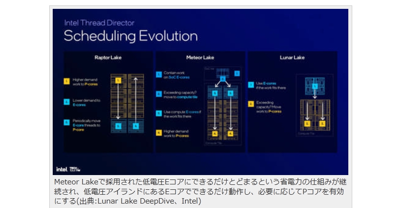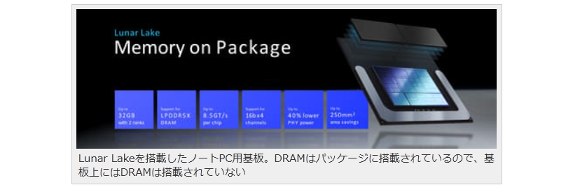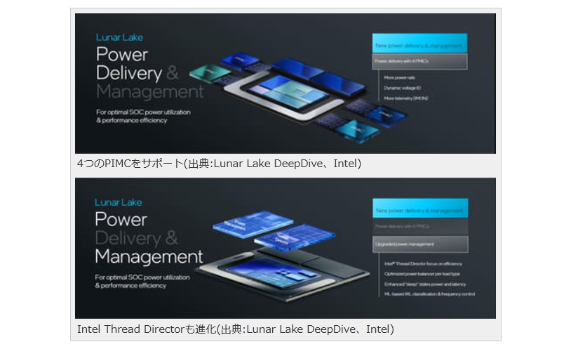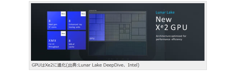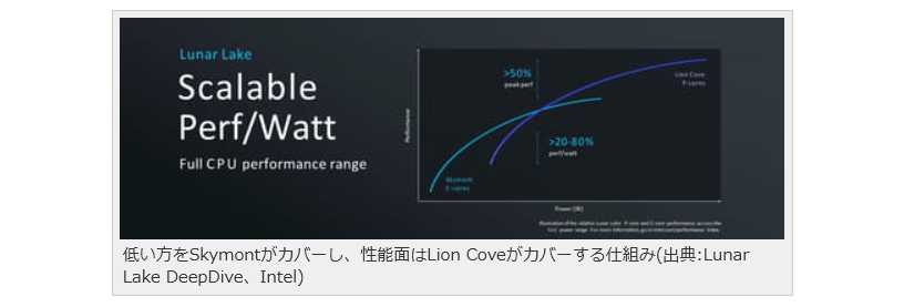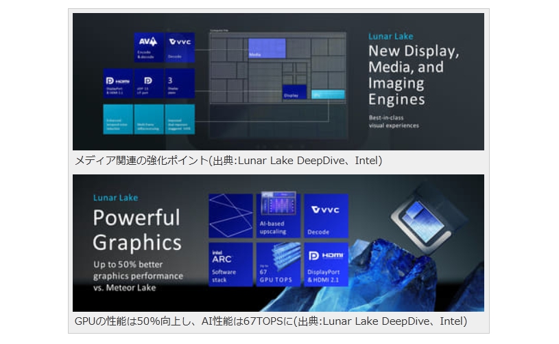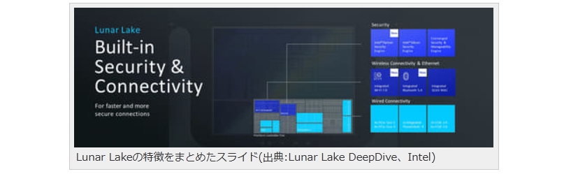 なお、ThunderboltのコントローラがThunderbolt 5(ないしはUSB4 Version 2.0)対応ではないのは、Lunar Lakeが薄型軽量ノートPCをターゲットにした製品であるためだろう。消費電力とのバランスを考えると、80GbpsというThunderbolt 5/USB4 Version 2.0は必要ないと判断された可能性が高い。