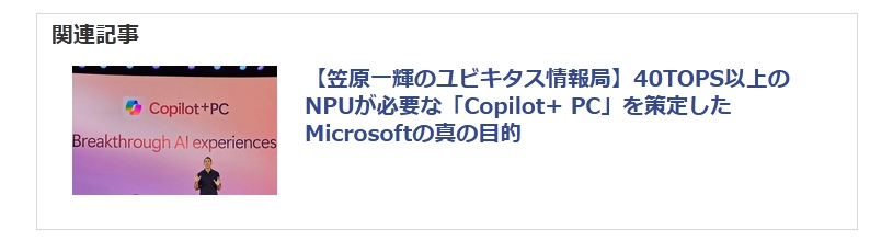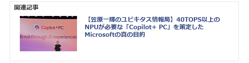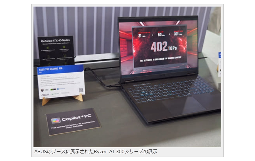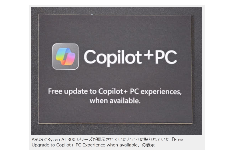 それぞれの詳細は別記事をご参照いただくとして、本記事では、ASUSのブースでAMDのRyzen AI 300シリーズを搭載した「Copilot+ PC」の注意書きとして貼られていた「Free Upgrade to Copilot+ PC Experience when available」がどんなことを意味するのかについて解説したい。