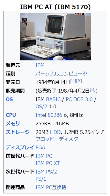 IBM PC AT (IBM 5170) 製造元 IBM 種別 パーソナルコンピュータ 発売日 1984年8月14日[1][2] 販売期間 (販売終了 1987年4月2日[3]) OS IBM BASIC / PC DOS 3.0 / OS/2 1.0 CPU Intel 80286 6, 8MHz メモリ 256KB – 16MB ストレージ 20MB HDD, 1.2MB 5.25インチ フロッピーディスク ディスプレイ EGA 前世代ハード