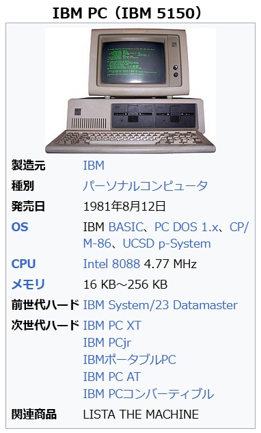 IBM PC(IBM 5150) 製造元 IBM 種別 パーソナルコンピュータ 発売日 1981年8月12日 OS IBM BASIC、PC DOS 1.x、CP/M-86、UCSD p-System CPU Intel 8088 4.77 MHz メモリ 16 KB~256 KB 前世代ハード IBM System/23 Datamaster 次世代ハード