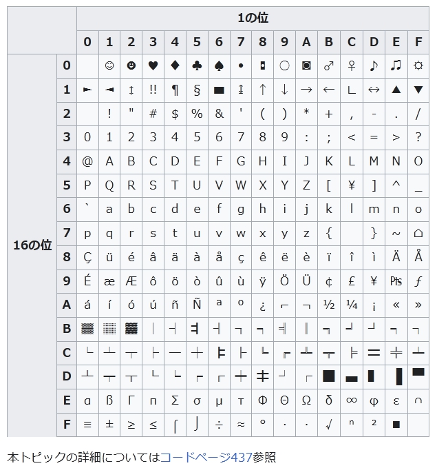 0 1 2 3 4 5 6 7 8 9 A B C D E F 16の位 0 ☺ ☻ ♥ ♦ ♣ ♠ • ◘ ○ ◙ ♂ ♀ ♪ ♫ ☼ 1 ► ◄ ↕ ‼ ¶ § ▬ ↨ ↑ ↓ → ← ∟ ↔ ▲ ▼ 2 ! ” # $ % & ‘ ( ) * + , – . / 3 0 1 2 3 4 5 6 7 8 9 : ; < = > ? 4 @ A B C D E F G H I J K L M N O 5 P Q R S T U V W X Y Z [ \ ] ^ _ 6 ` a b c d e f g h i j k l m n o 7 p q r s t u v w x y z { } ~ ⌂ 8 Ç ü é â ä à å ç ê ë è ï î ì Ä Å 9 É æ Æ ô ö ò û ù ÿ Ö Ü ¢ £ ¥ ₧ ƒ A á í ó ú ñ Ñ ª º ¿ ⌐ ¬ ½ ¼ ¡ « » B ░ ▒ ▓ │ ┤ ╡ ╢ ╖ ╕ ╣ ║ ╗ ╝ ╜ ╛ ┐ C └ ┴ ┬ ├ ─ ┼ ╞ ╟ ╚ ╔ ╩ ╦ ╠ ═ ╬ ╧ D ╨ ╤ ╥ ╙ ╘ ╒ ╓ ╫ ╪ ┘ ┌ █ ▄ ▌ ▐ ▀ E α ß Γ π Σ σ µ τ Φ Θ Ω δ ∞ φ ε ∩ F ≡ ± ≥ ≤ ⌠ ⌡ ÷ ≈ ° ∙ · √ ⁿ ² ■